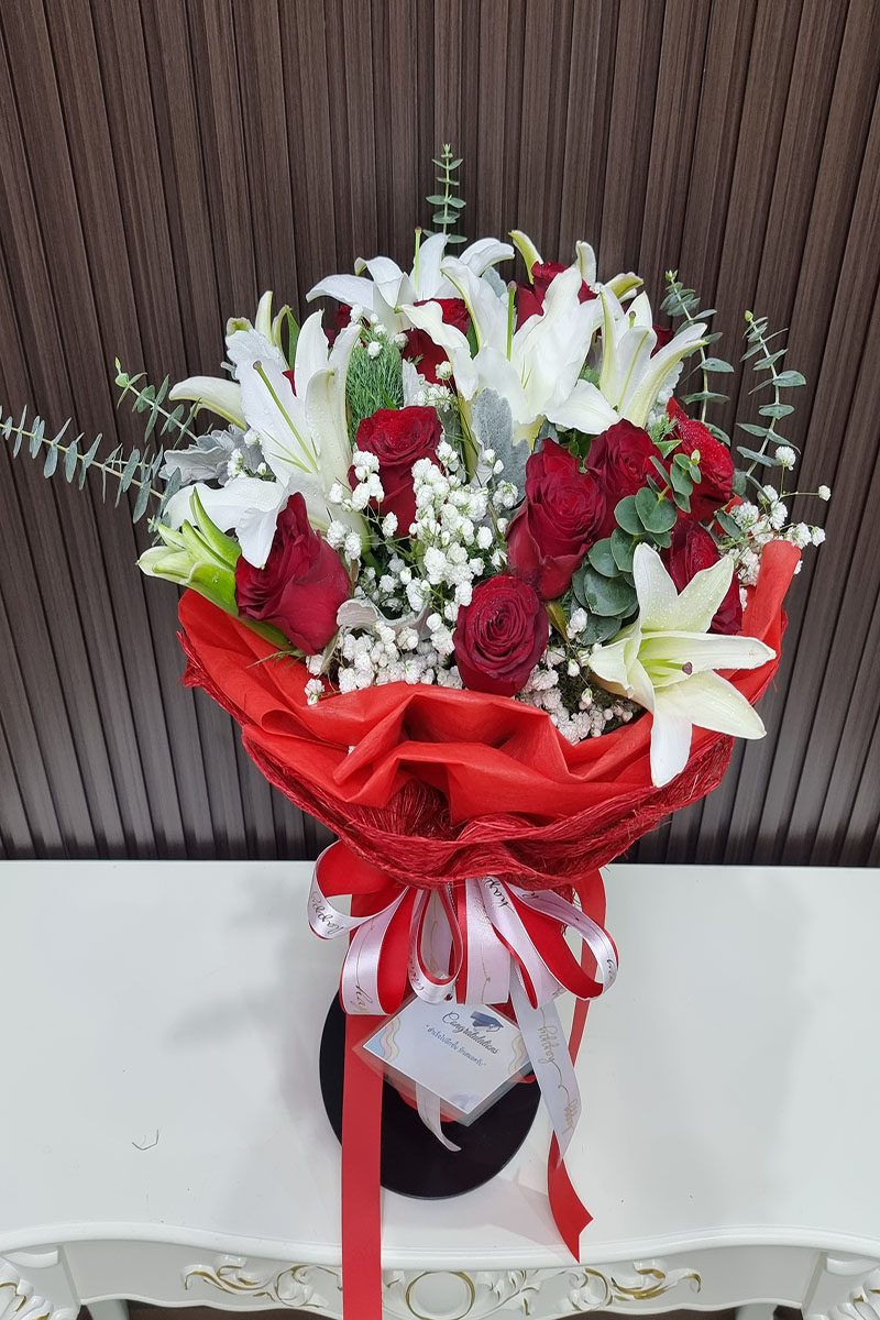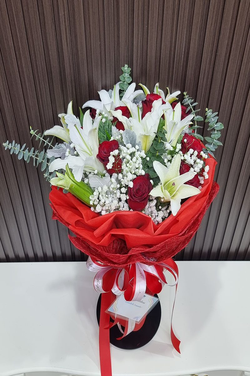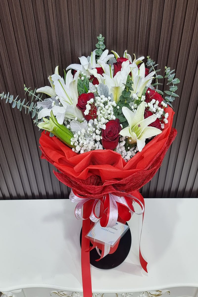 ดอกลิลลี่  ดอกกุหลาบแดง จัดช่อ แซมดอกยิปซี แคสเปียร์