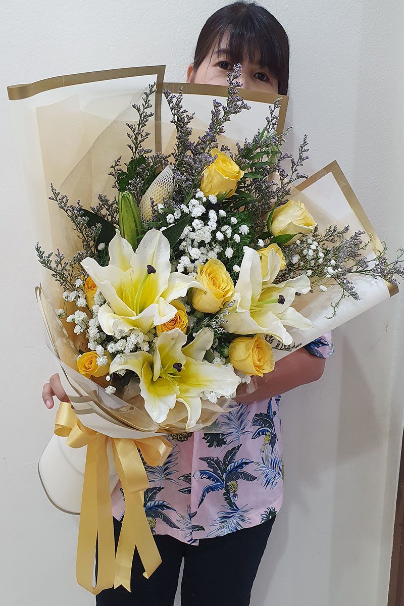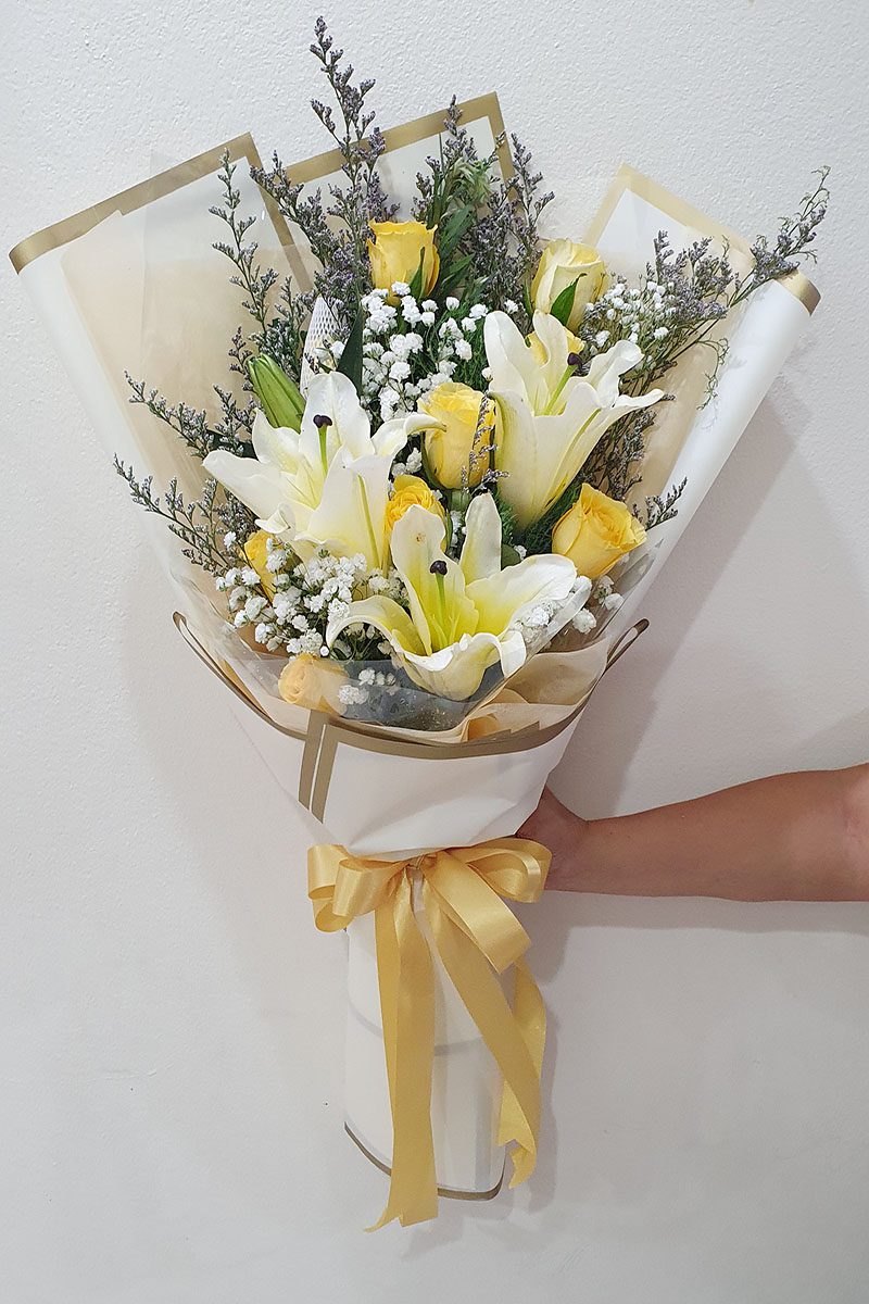 ดอกลิลลี่  ดอกกุหลาบสีเหลือง จัดช่อ แซมดอกยิปซี แคสเปียร์