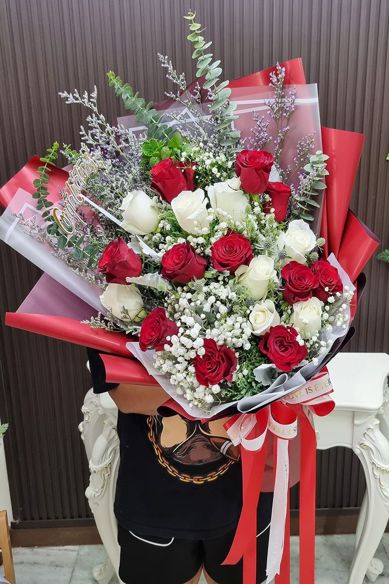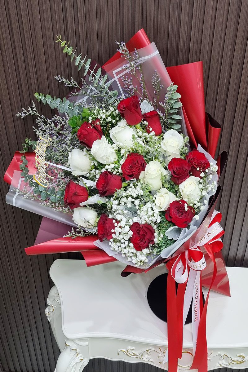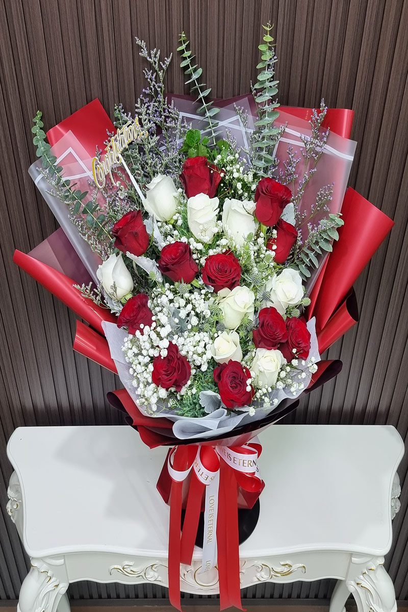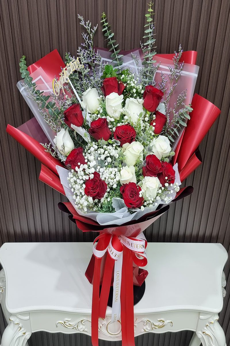 ความหมาย: ช่อดอกกุหลาบขาวแดง สื่อถึง ความรักที่สมบูรณ์แบบ ความรักที่ผสมผสานระหว่างความรักที่บริสุทธิ์ โรแมนติก เร่าร้อน และความภักดี เหมาะสำหรับมอบให้กับบุคคลพิเศษ ในโอกาสสำคัญต่างๆ เช่น วันครบรอบแต่งงาน วันวาเลนไทน์ หรือแสดงความยินดี