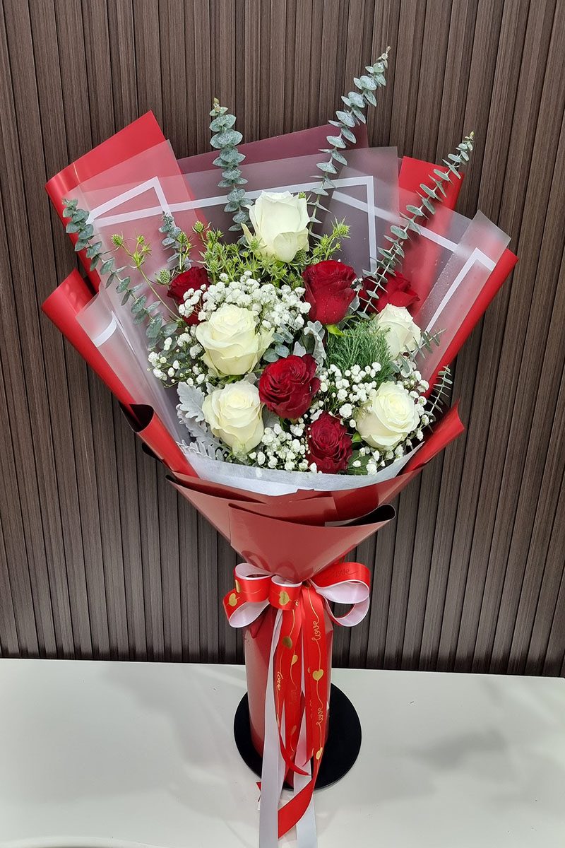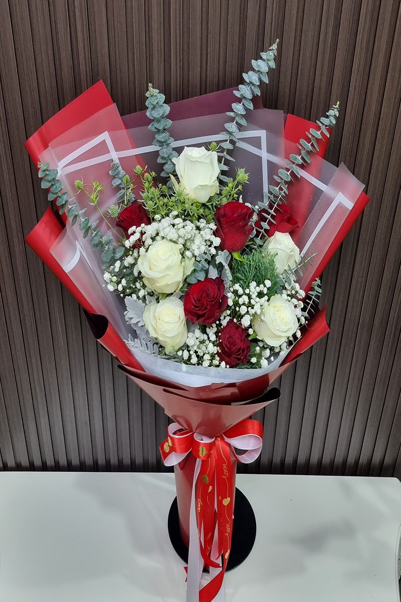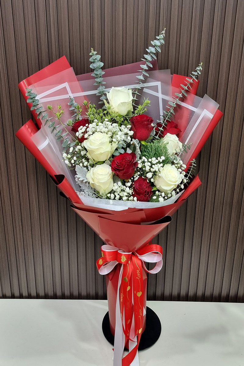 ความหมาย: ช่อดอกกุหลาบขาวแดง สื่อถึง ความรักที่สมบูรณ์แบบ ความรักที่ผสมผสานระหว่างความรักที่บริสุทธิ์ โรแมนติก เร่าร้อน และความภักดี เหมาะสำหรับมอบให้กับบุคคลพิเศษ ในโอกาสสำคัญต่างๆ เช่น วันครบรอบแต่งงาน วันวาเลนไทน์ หรือแสดงความยินดี