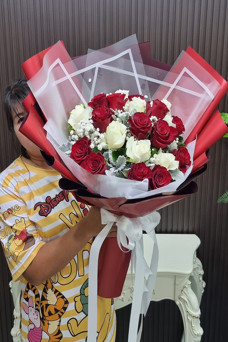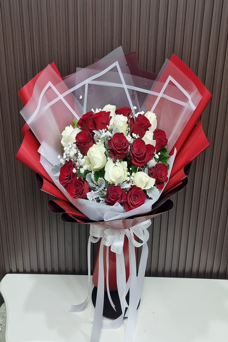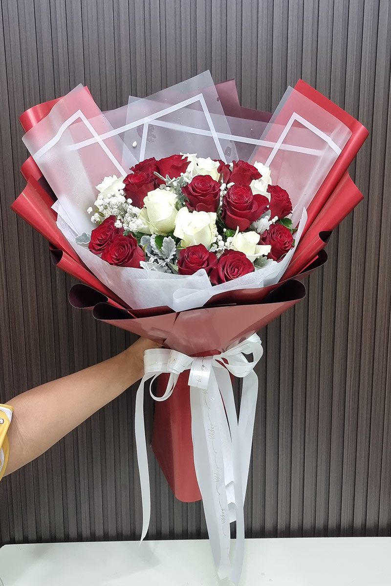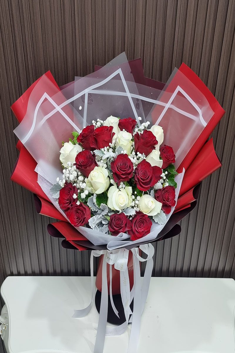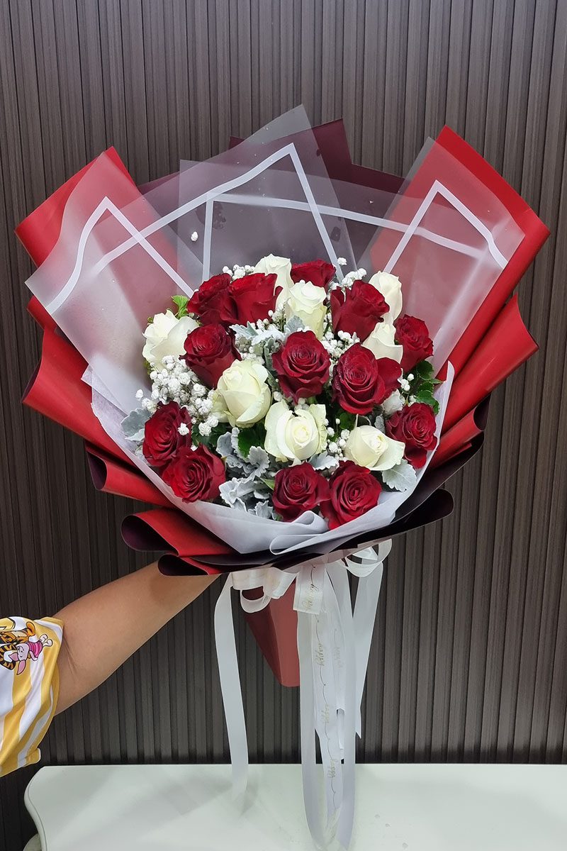 ความหมาย: ช่อดอกกุหลาบขาวแดง สื่อถึง ความรักที่สมบูรณ์แบบ ความรักที่ผสมผสานระหว่างความรักที่บริสุทธิ์ โรแมนติก เร่าร้อน และความภักดี เหมาะสำหรับมอบให้กับบุคคลพิเศษ ในโอกาสสำคัญต่างๆ เช่น วันครบรอบแต่งงาน วันวาเลนไทน์ หรือแสดงความยินดี