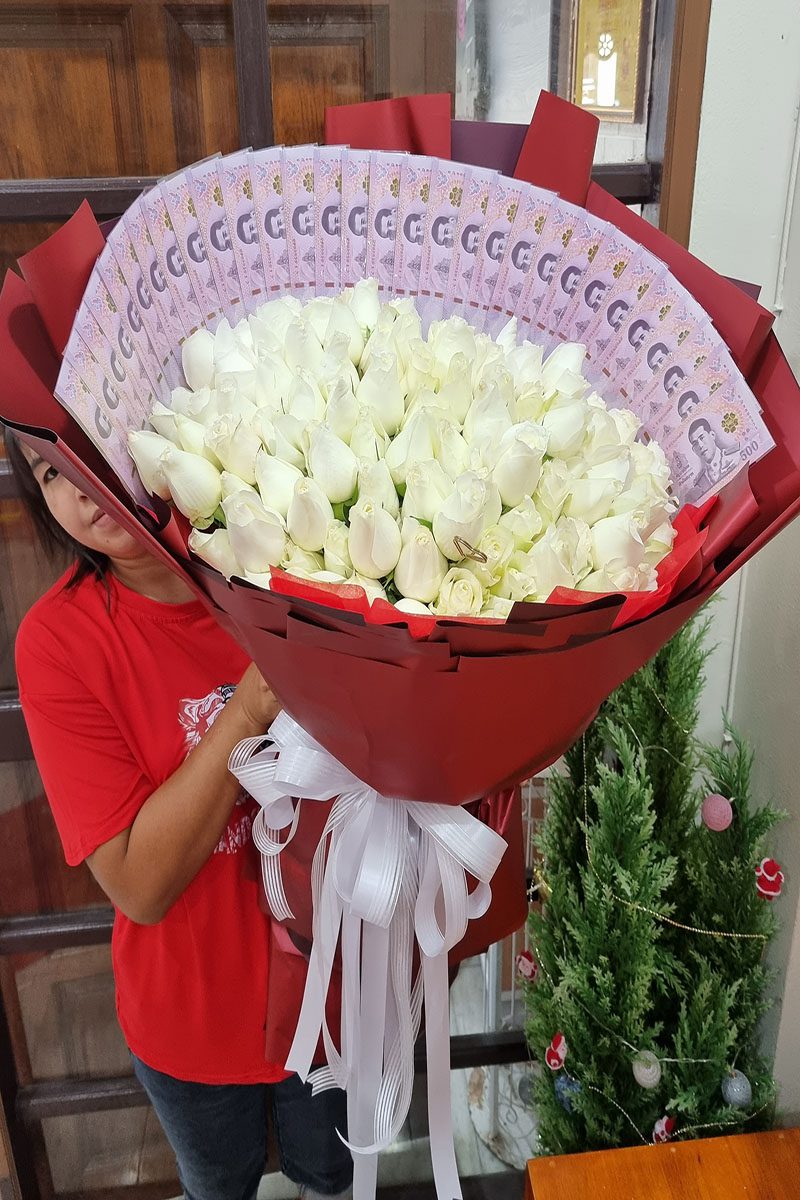 ช่อเรียงแบงค์ร้อยในช่อดอกไม้