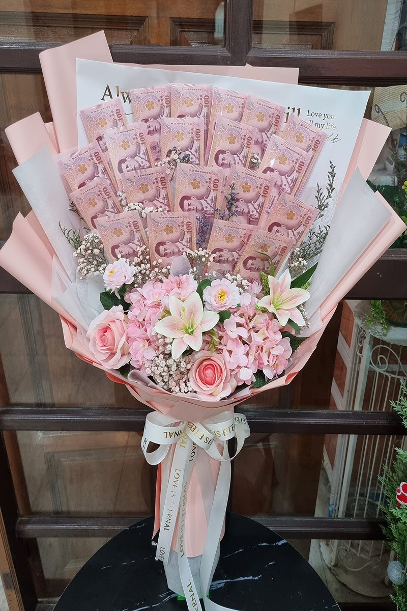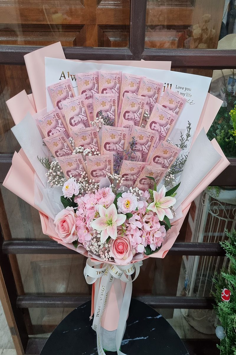 ราคาช่อจะขึ้นอยู่กับ เงินในช่อ ขนาดช่อ และดอกไม้ตกแต่งภายในช่อ