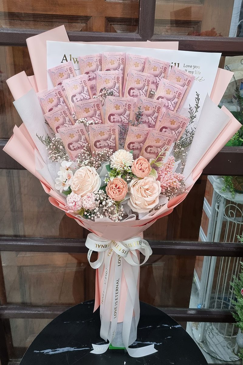 ทั้งจำนวนเงินในช่อ  ชนิดของแบงค์ 100/500/1000  โทนสีดอกไม้  และกระดาษห่อ เปลี่ยนได้
