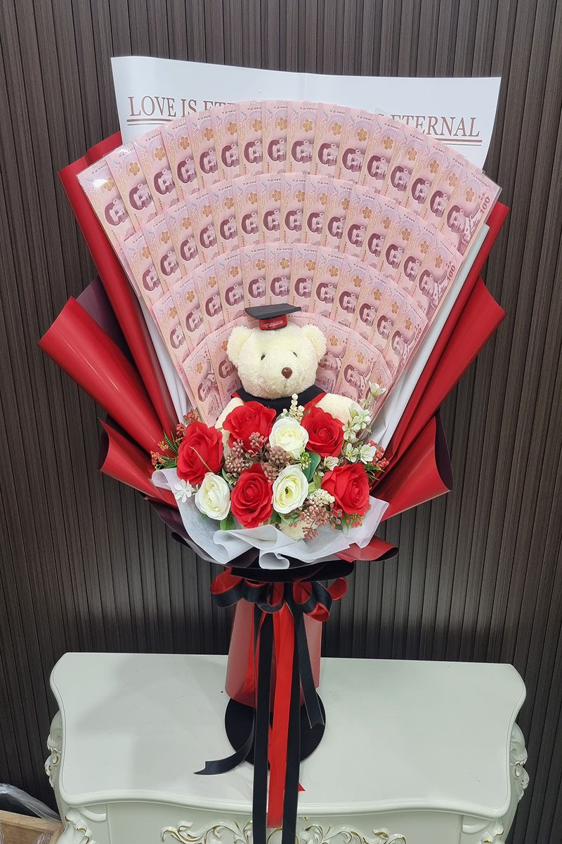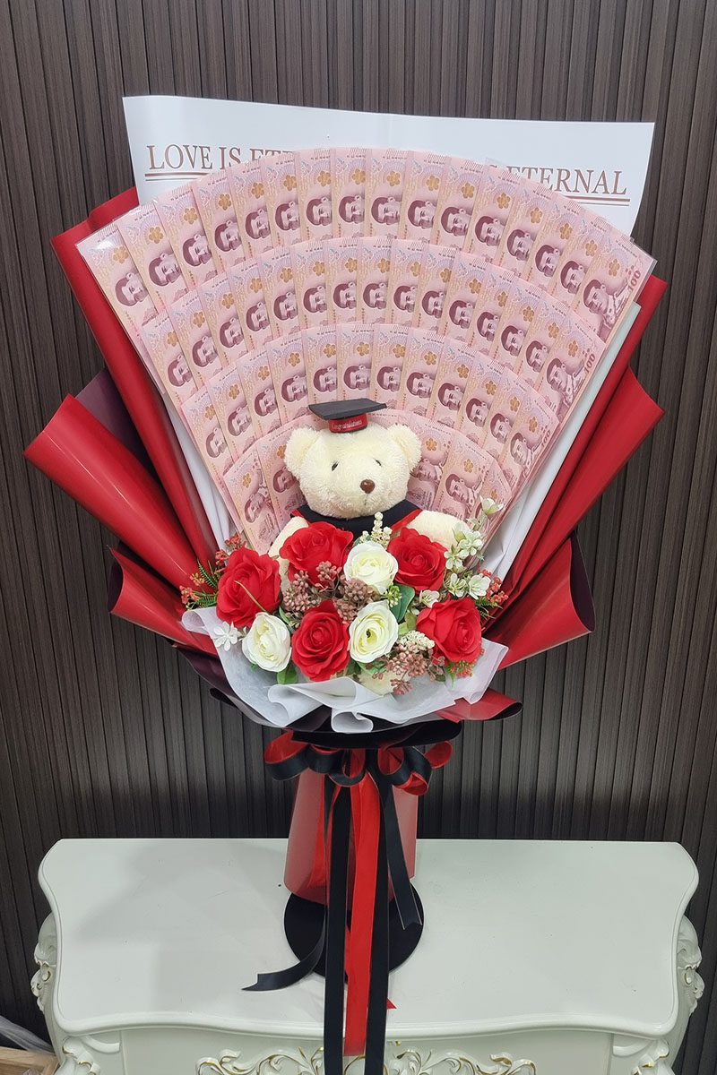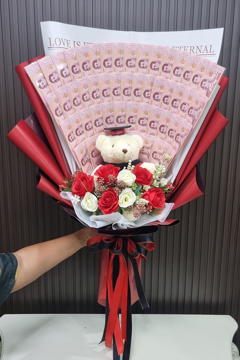 จัดช่อ ดอกไม้ประดิษฐ์สีแดง กับตุ๊กตาหมีสวมชุดครุย ตกแต่งเพื่อให้สวยงาม ดูกลมกลืน