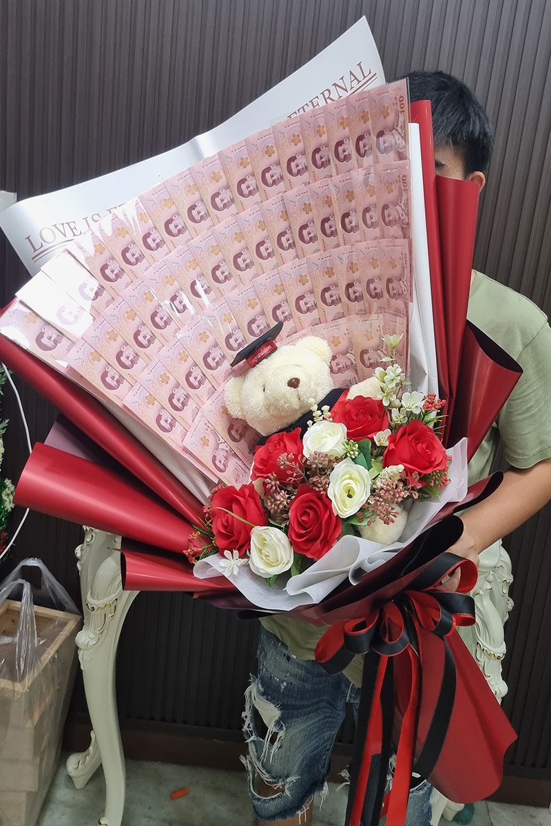 ราคาช่อจะขึ้นอยู่กับ เงินในช่อ ขนาดช่อ และดอกไม้ตกแต่งภายในช่อ