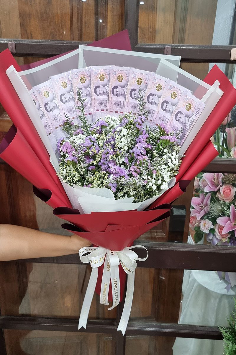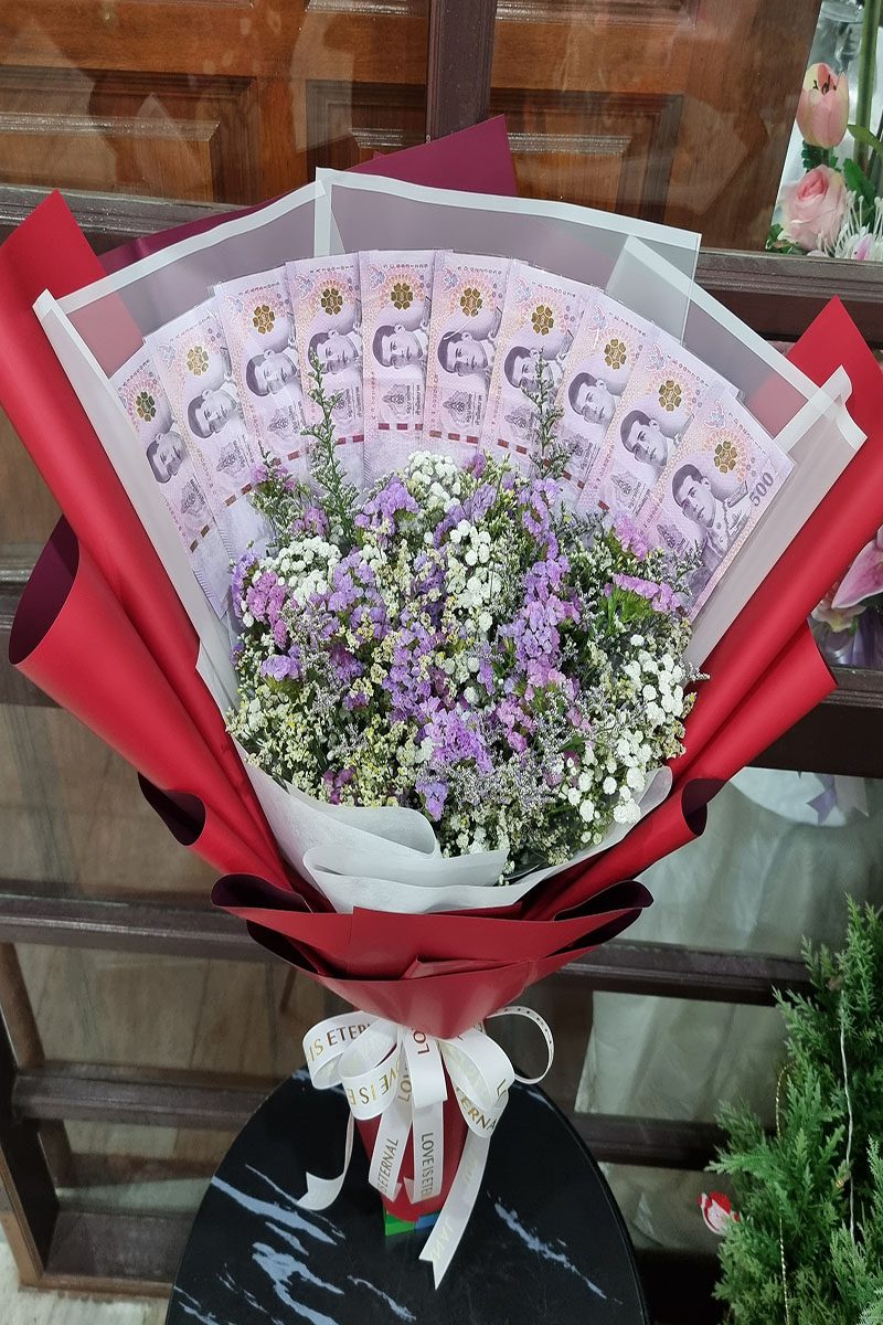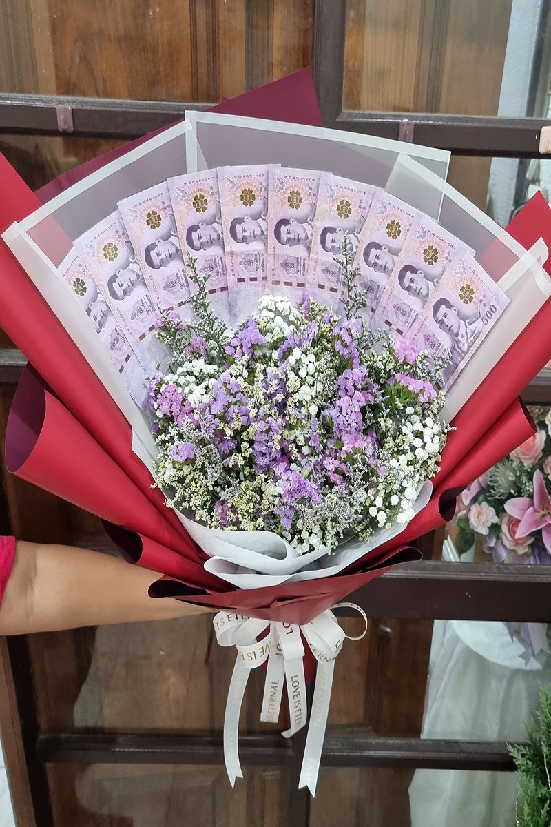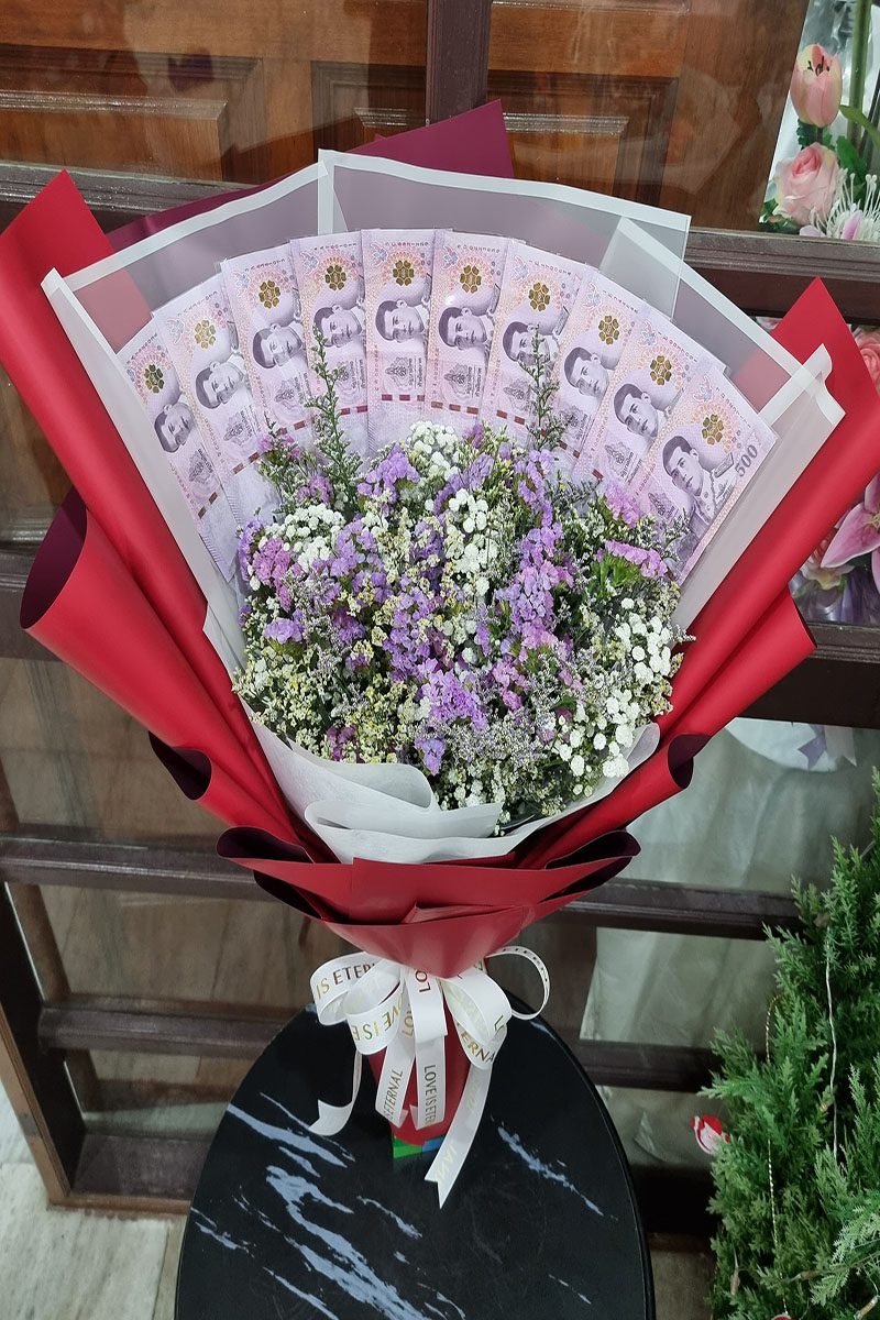 ราคาช่อจะขึ้นอยู่กับ เงินในช่อ ขนาดช่อ และดอกไม้ตกแต่งภายในช่อ