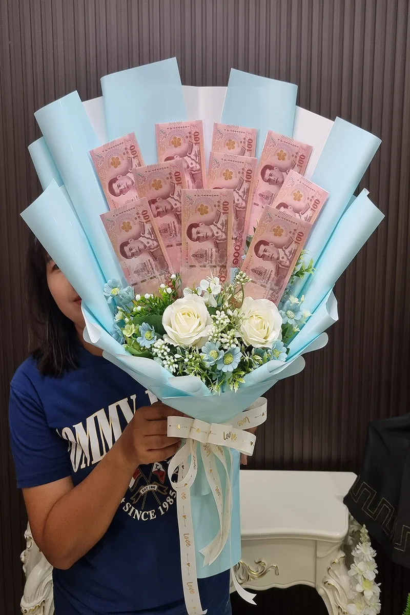 ราคาช่อจะขึ้นอยู่กับ เงินในช่อ ขนาดช่อ และดอกไม้ตกแต่งภายในช่อ