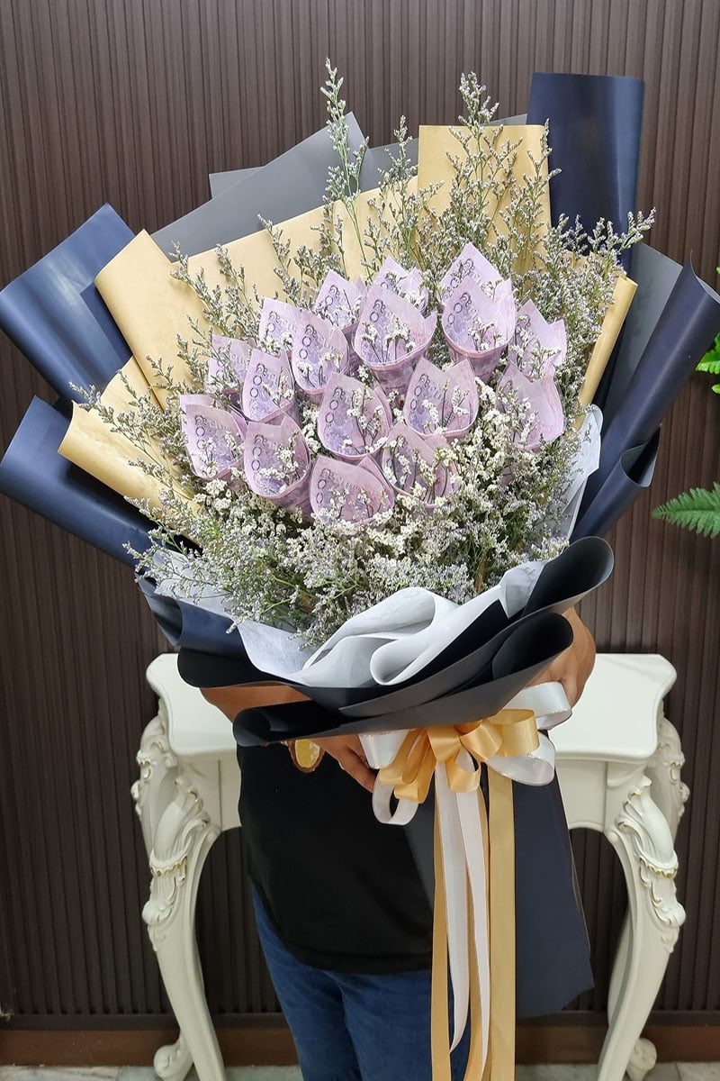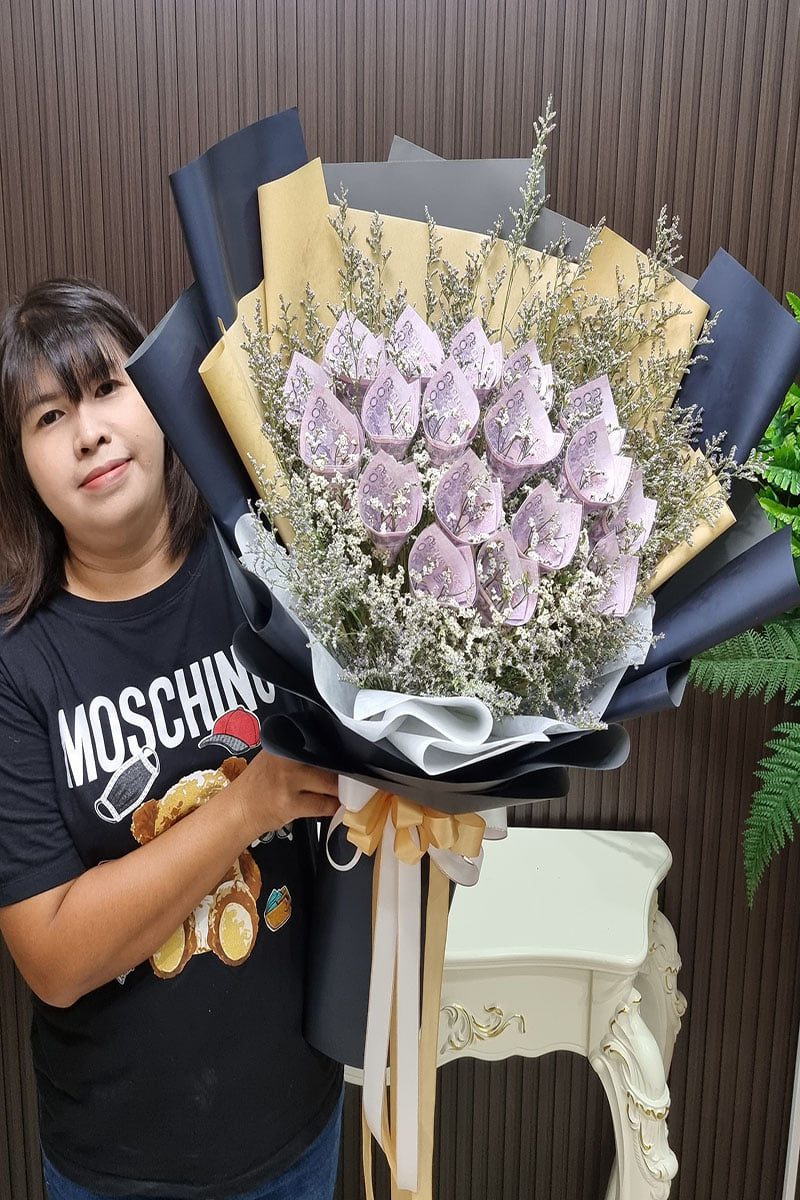 ราคาช่อจะขึ้นอยู่กับ เงินในช่อ ขนาดช่อ และดอกไม้ตกแต่งภายในช่อ
