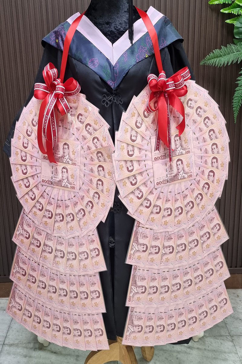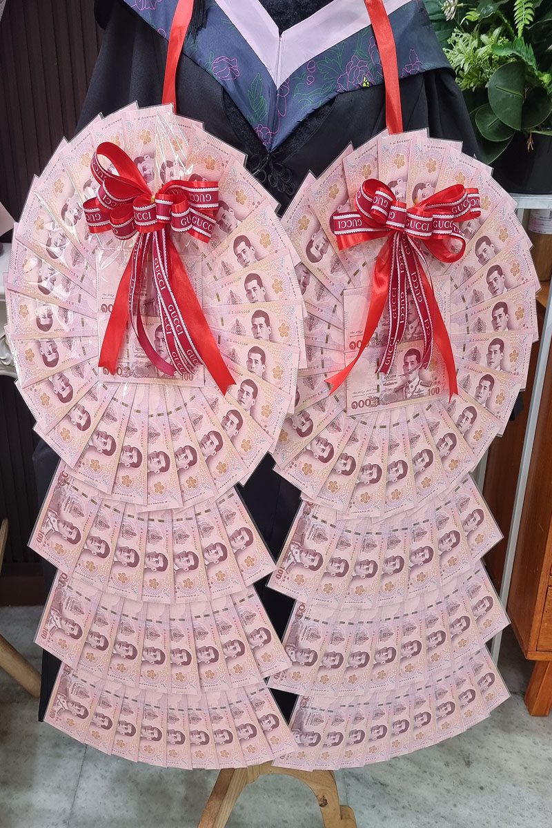 ใช้แบงค์ร้อย เรียงวงกลม ติดโบว์สีแดง ข้างละ 50 ใบ