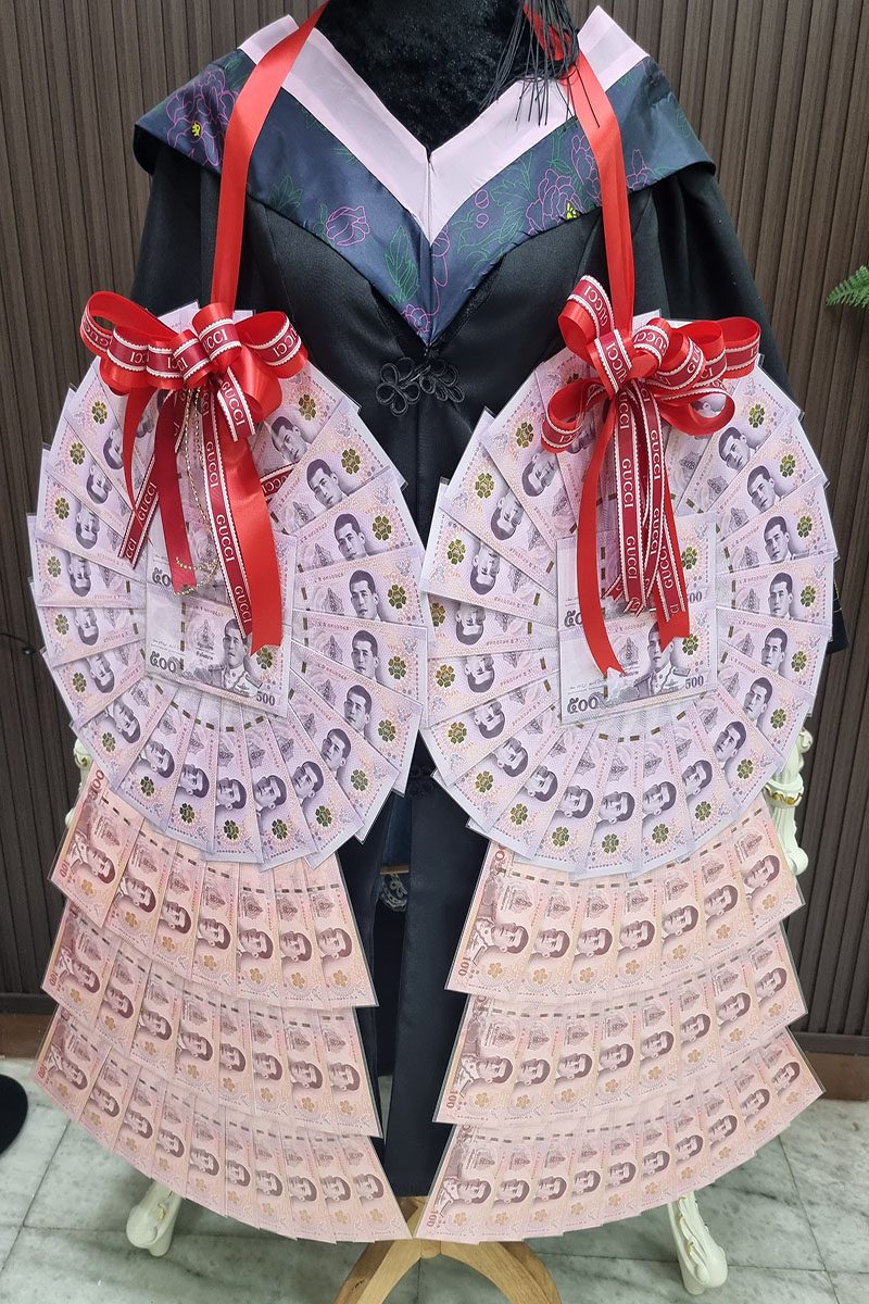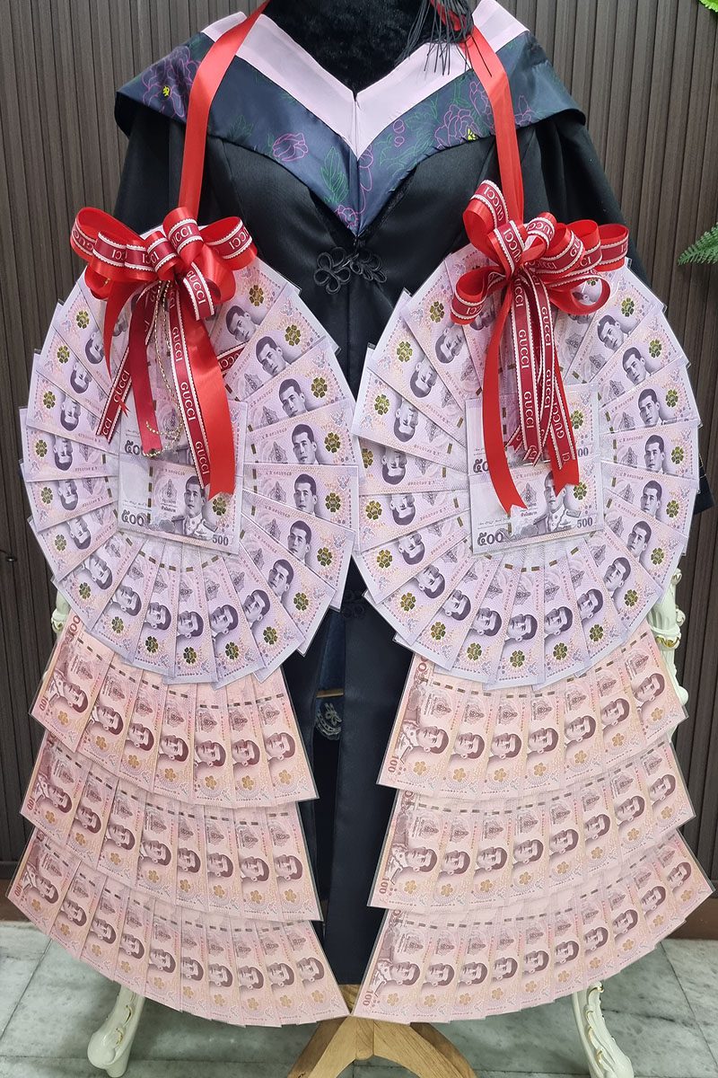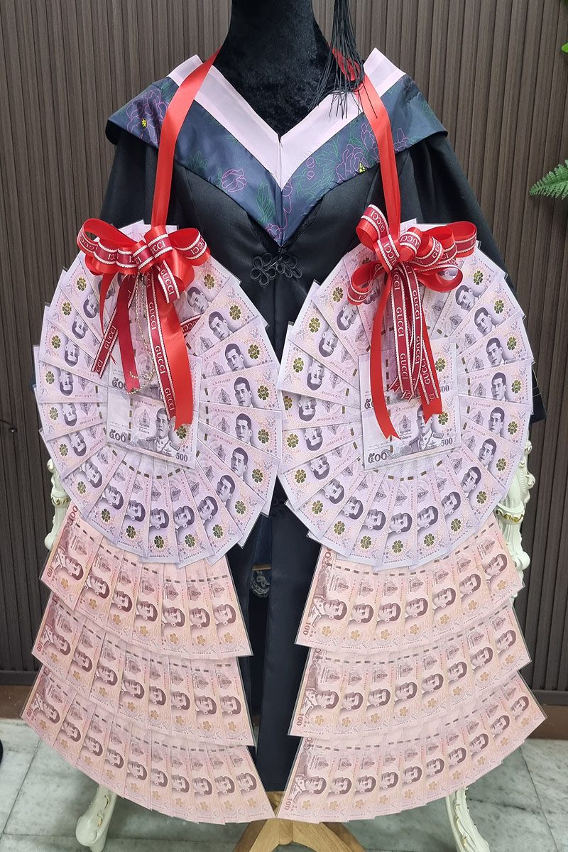 ใช้แบงค์500  เรียงวงกลม ติดโบว์สีแดง ข้างละ 25 ใบ แบงค์ร้อย เรียงด้านล่าง ข้างละ 25 ใบ