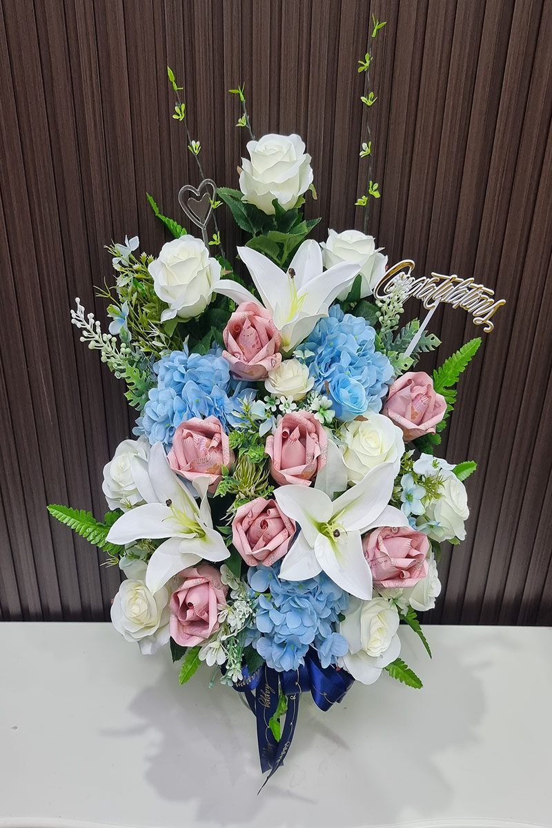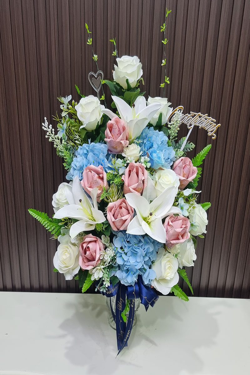 จัดเข้าช่อ แซมดอกไม้ประดิษฐ์ สีขาว ฟ้า ตกแต่งเพื่อให้สวยงาม ดูกลมกลืน