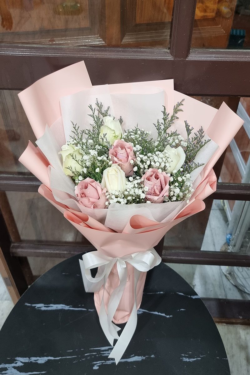 กระเช้าดอกไม้สดโทนสีอ่อน-สีชมพู