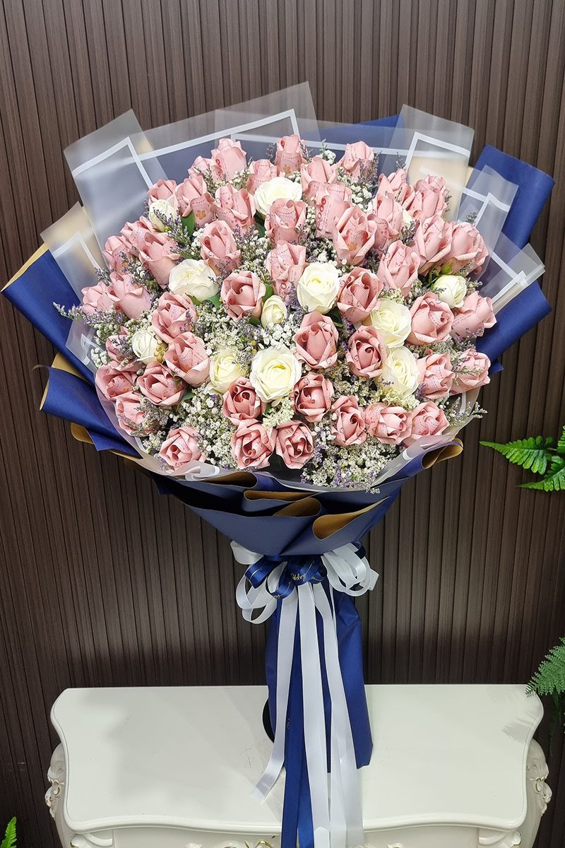 จัดเข้าช่อ แซมดอกไม้สด ดอกกุหลาบ ดอกยิปซี สุ่ยขาว และแคสเปียร์ ตกแต่งเพื่อให้สวยงาม ดูกลมกลืน