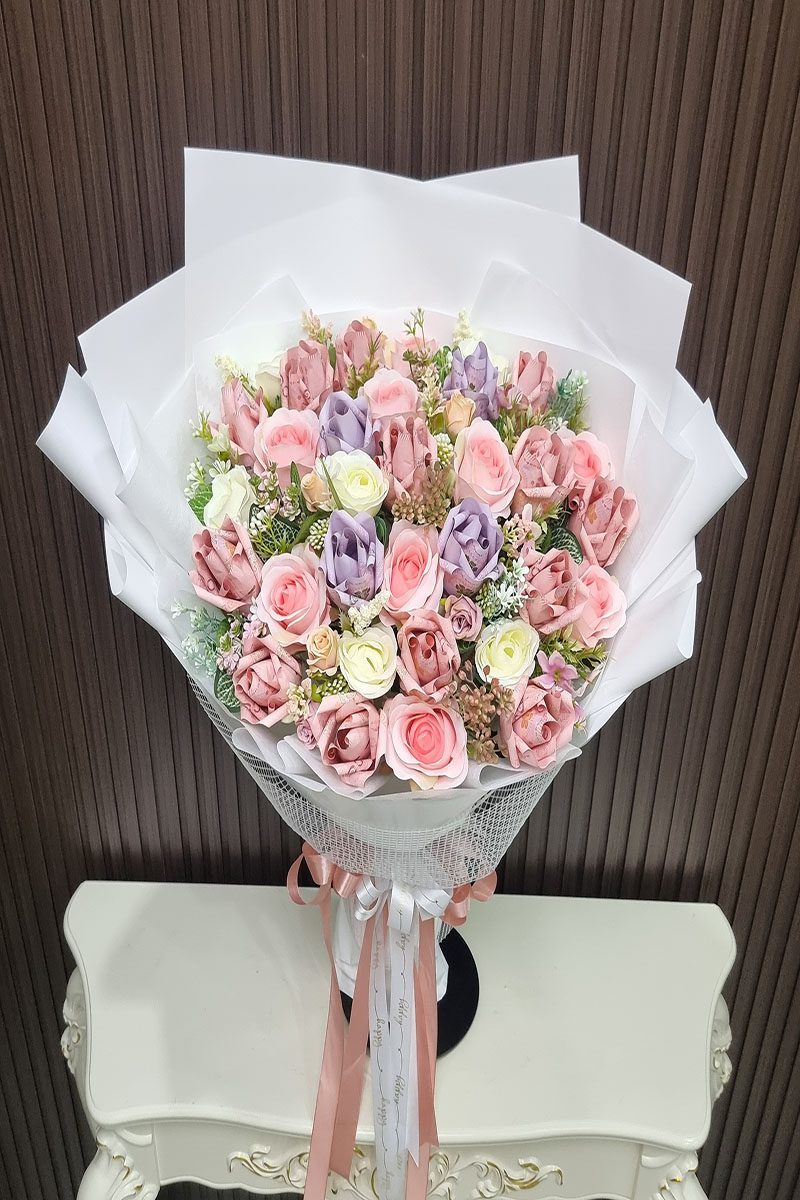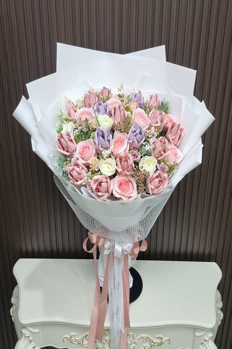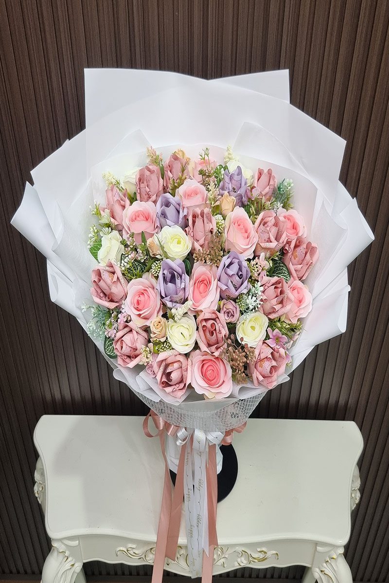 จัดเข้าช่อ แซมดอกไม้ประดิษฐ์ โทนสีชมพู ตกแต่งเพื่อให้สวยงาม ดูกลมกลืน