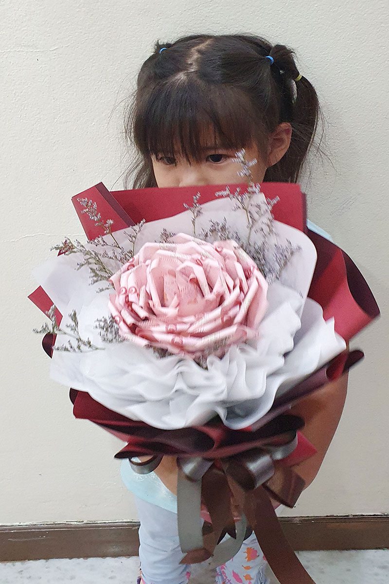 แบบม้วนเป็นดอกไม้ : จะนำแบงค์มาม้วนๆ แล้วแซมดอกไม้ตกแต่งเป็นเกษร เป็นดอกไม้ต่างๆ จัดทำเป็นช่อ ดูแปลกใหม่ สวยไม่ซ้ำใคร