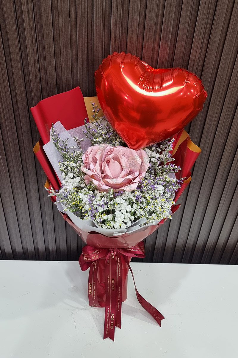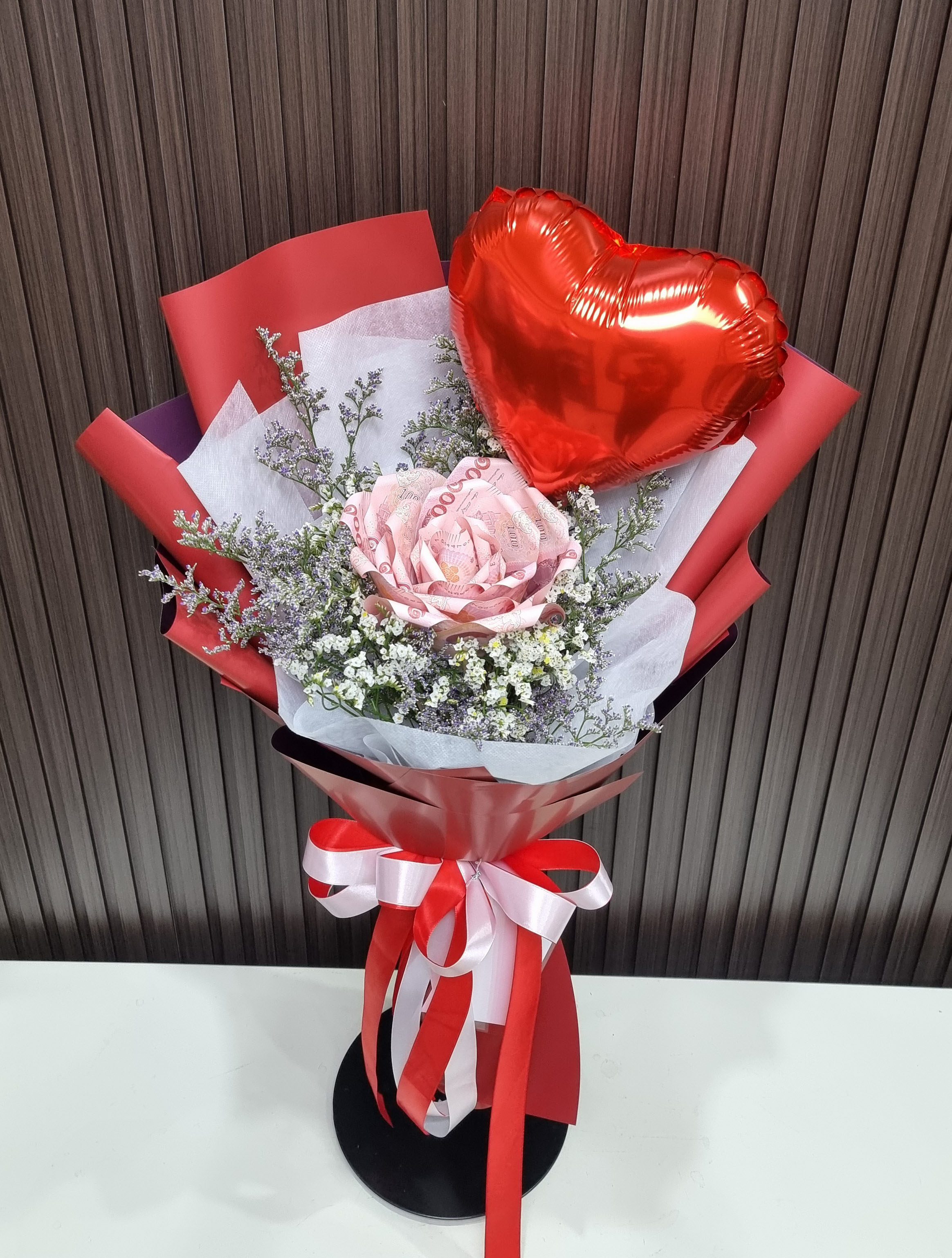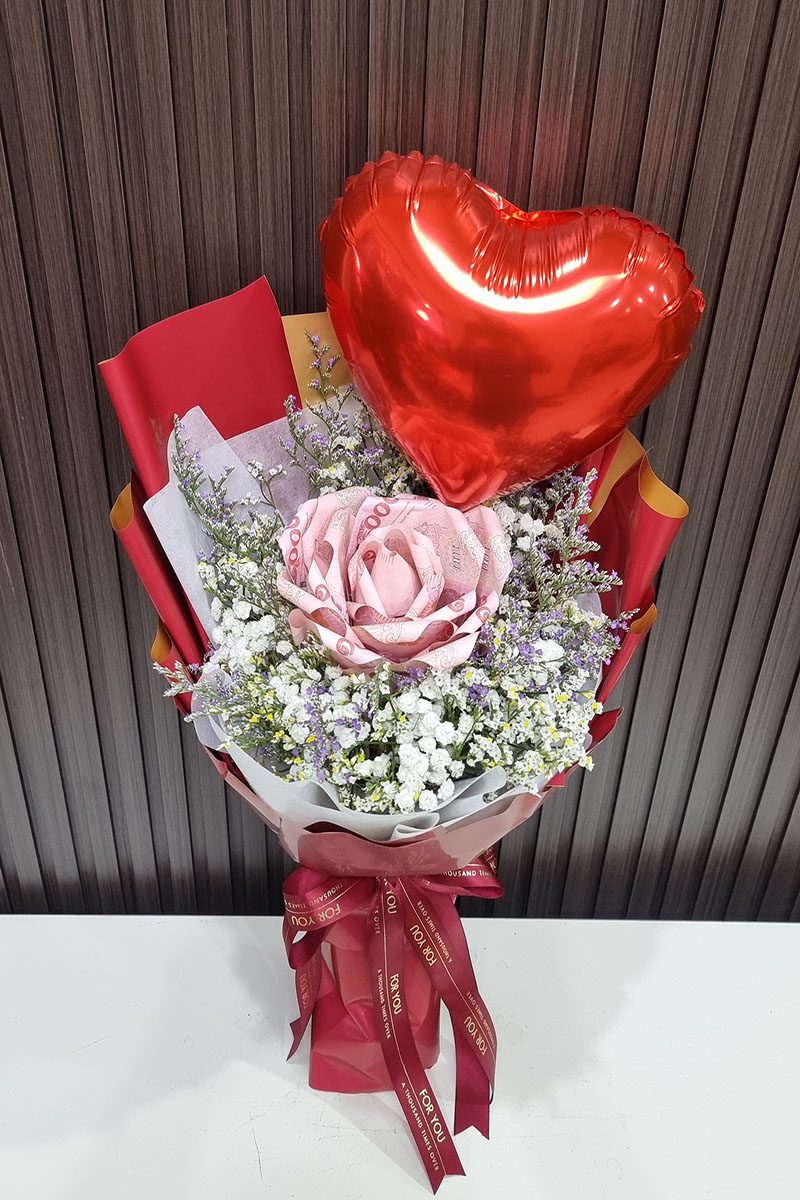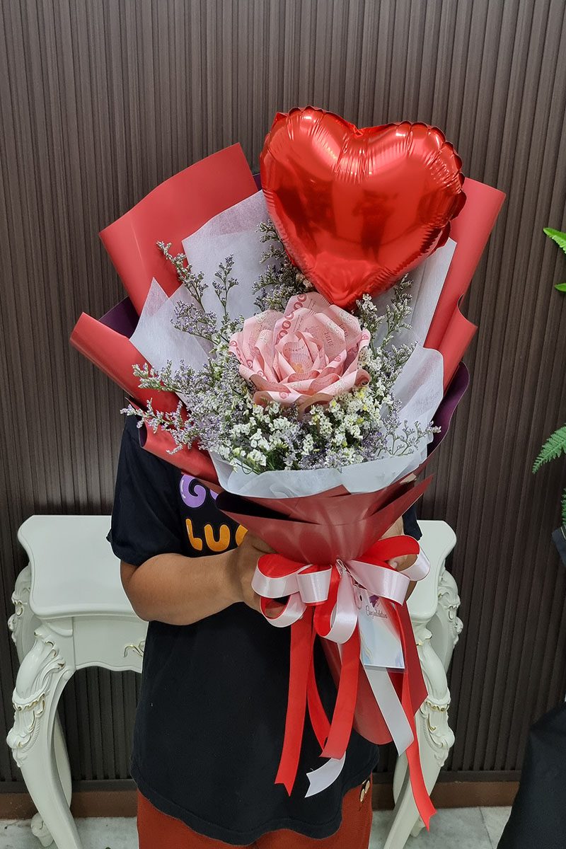 ช่อแบงค์พับดอกใหญ่   ใส่เงินทั้งหมด   1,000   บาท แบงค์ 10 ใบพับดอก ใส่ลูกโป่งรูปหัวใจ