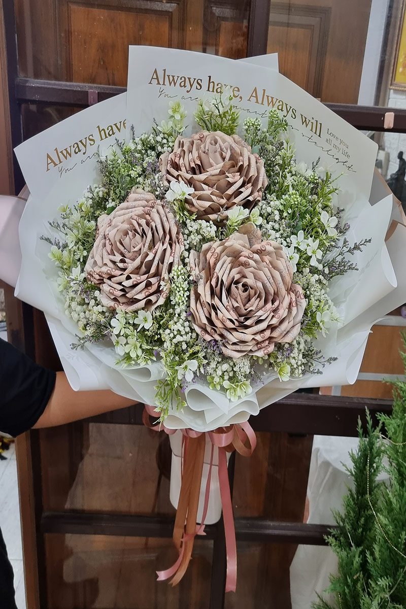 แบบม้วนเป็นดอกไม้ : จะนำแบงค์มาม้วนๆ แล้วแซมดอกไม้ตกแต่งเป็นเกษร เป็นดอกไม้ต่างๆ จัดทำเป็นช่อ ดูแปลกใหม่ สวยไม่ซ้ำใคร