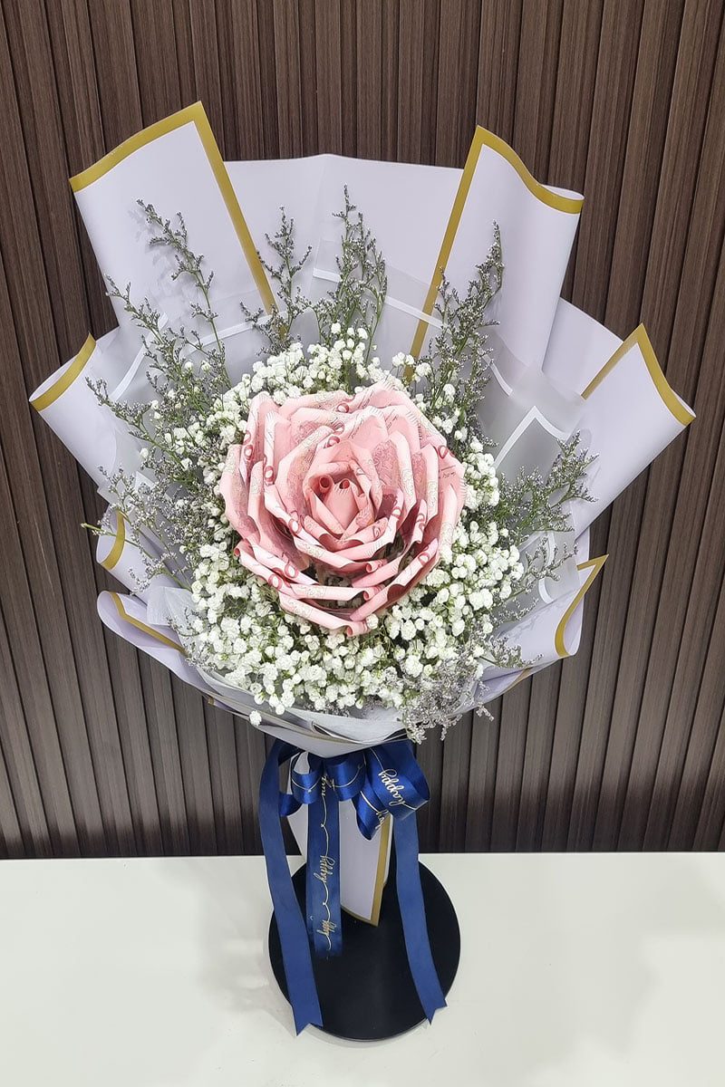 ช่อแบงค์พับดอกใหญ่   ใส่เงินทั้งหมด   1,000   บาท แบงค์ 10 ใบพับดอก