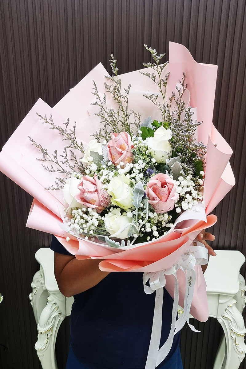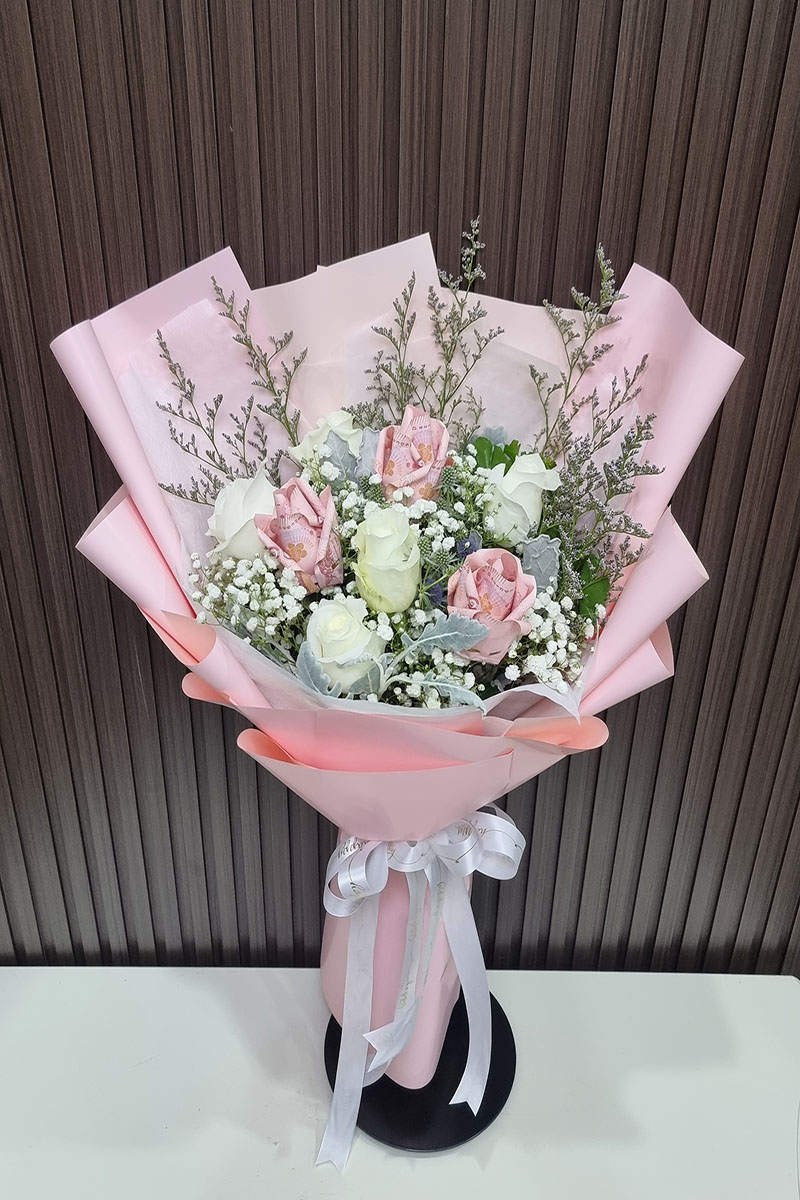 จัดเข้าช่อ รวมกับดอกกุหลาบขาว 5 ดอก แซมดอกไม้สด ดอกยิปซี สุ่ยขาว และแคสเปียร์ ตกแต่งเพื่อให้สวยงาม ดูกลมกลืน