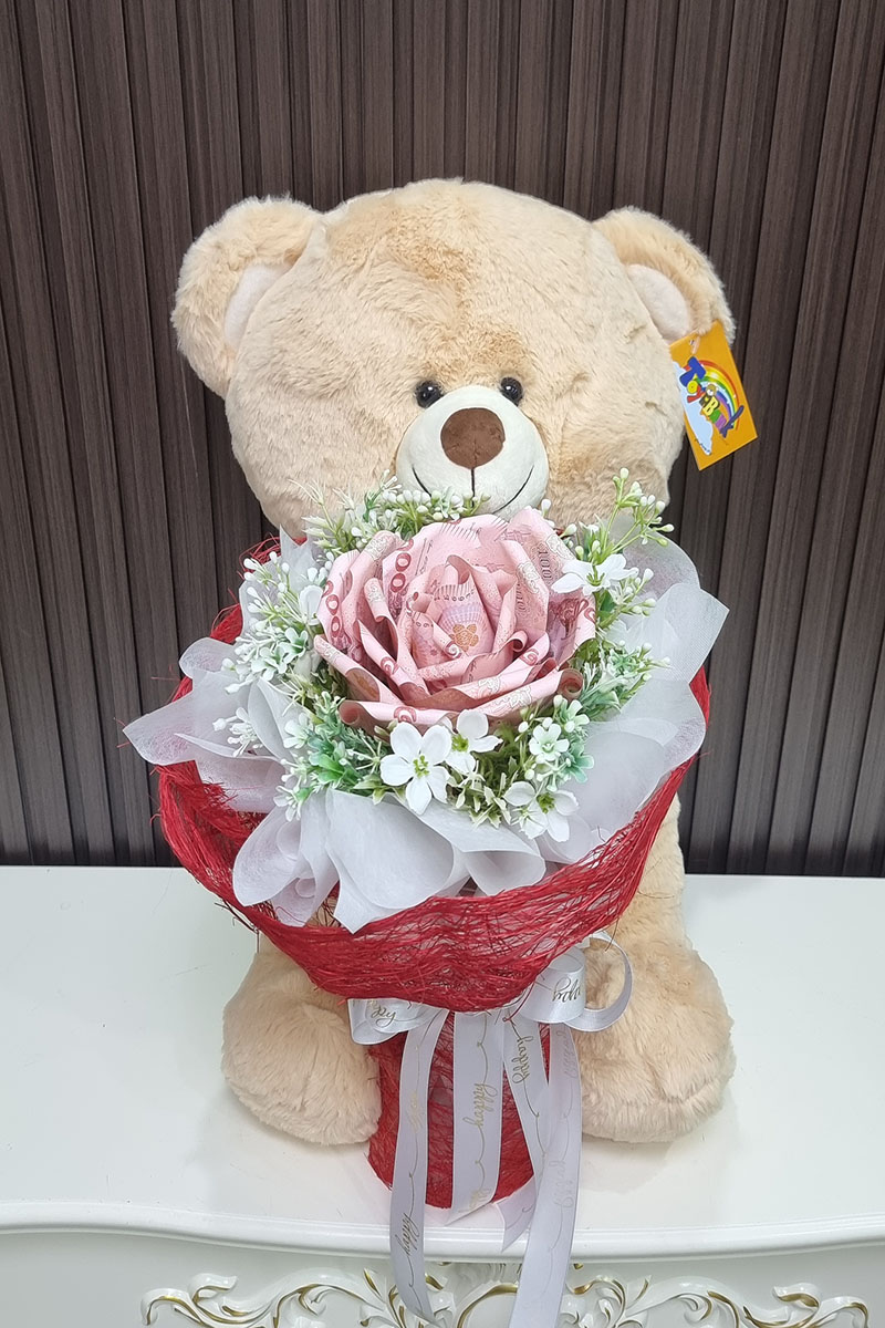ช่อแบงค์พับดอกกุหลาบ   ใส่เงินทั้งหมด   1,000   บาท แบงค์ 10 ใบพับดอกใหญ่