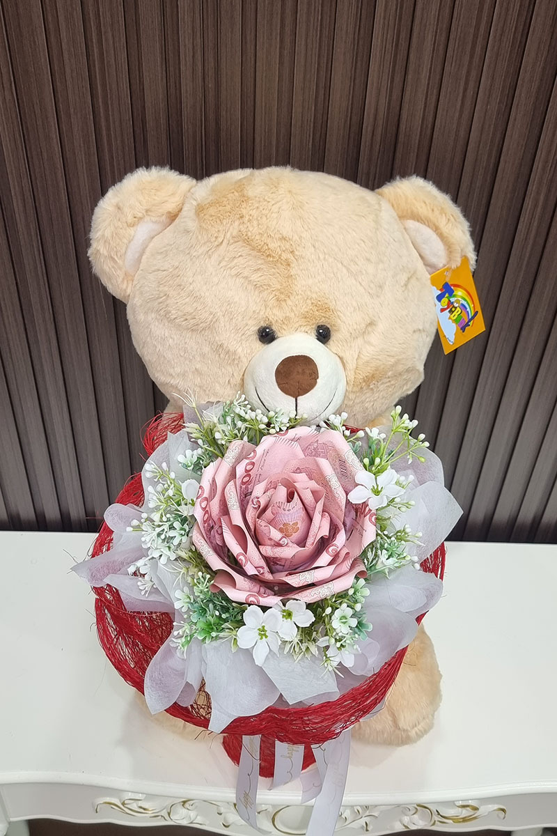 จัดเข้าช่อ แซมดอกไม้สด ดอกยิปซี สุ่ยขาว และแคสเปียร์ จับคู่กับตุ๊กตาหมี ขนาด 18 นิ้ว ตกแต่งเพื่อให้สวยงาม ดูกลมกลืน