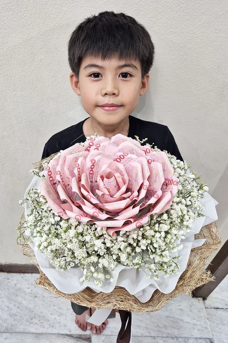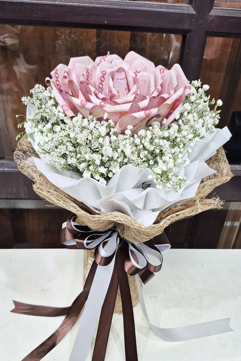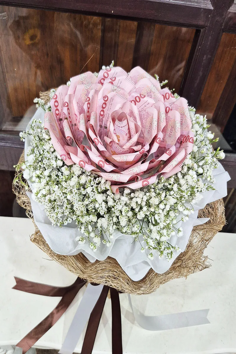 ช่อแบงค์พับดอกใหญ่   ใส่เงินทั้งหมด   2,000   บาท แบงค์ 20 ใบพับดอก