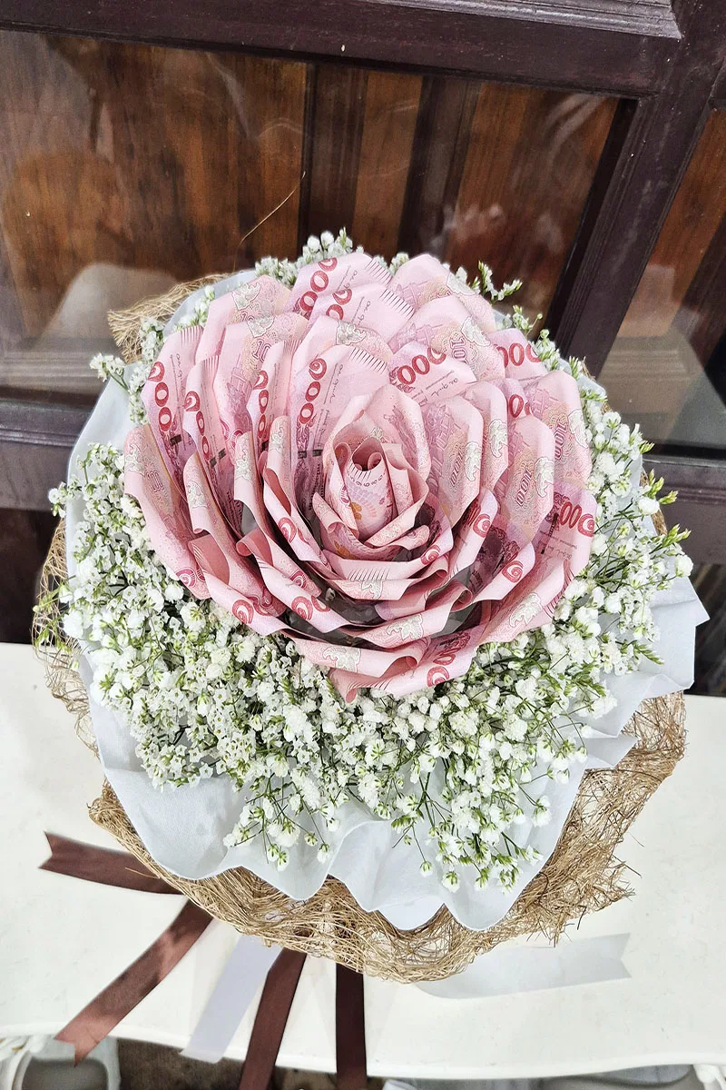 แบบม้วนเป็นดอกไม้ : จะนำแบงค์มาม้วนๆ แล้วแซมดอกไม้ตกแต่งเป็นเกษร เป็นดอกไม้ต่างๆ จัดทำเป็นช่อ ดูแปลกใหม่ สวยไม่ซ้ำใคร