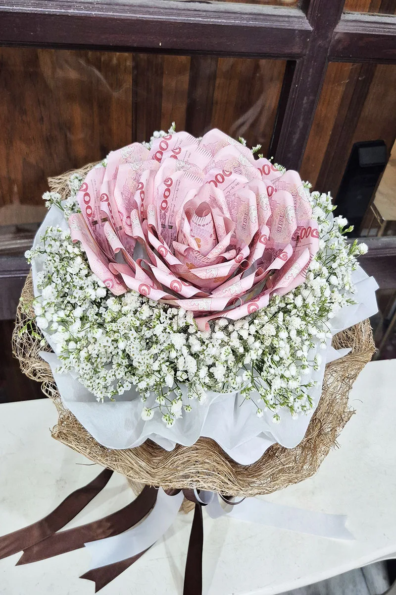 แบบพับเป็นดอกไม้: นิยมใช้แบงค์ 50 บาท 100 บาท 500 บาท และ 1000 บาท พับเป็นรูปดอกกุหลาบ ดอกบัว หรือดอกอื่นๆ