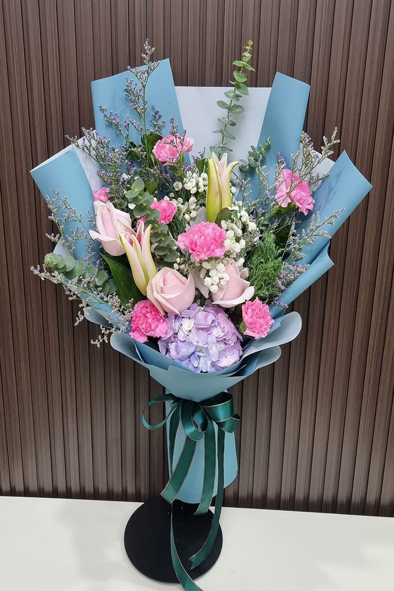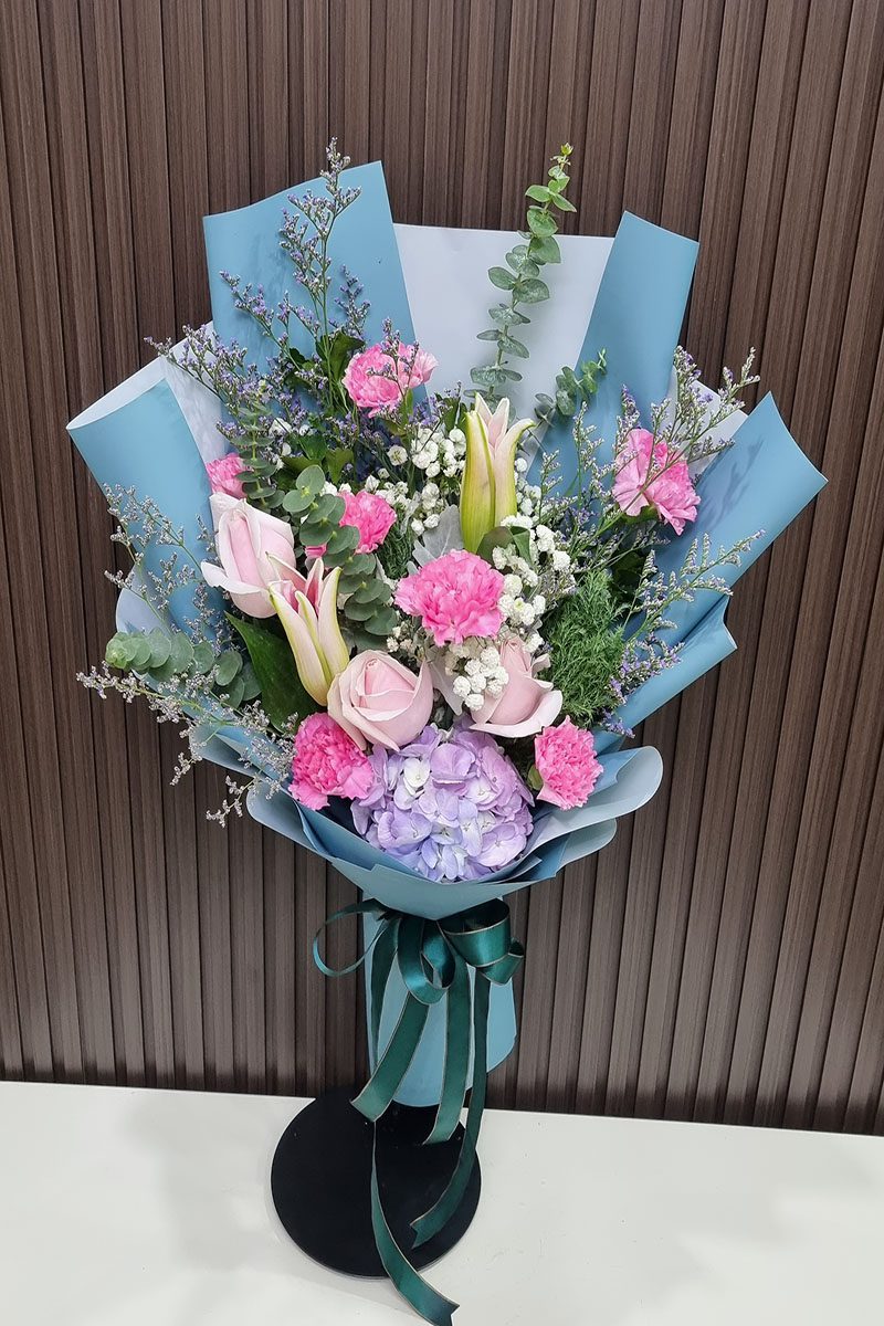 ดอกกุหลาบ  ดอกลิลลี่ ดอกไฮเดรนเยีย และดอกคานชั่น จัดช่อ แซมดอกยิปซี แคสเปียร์