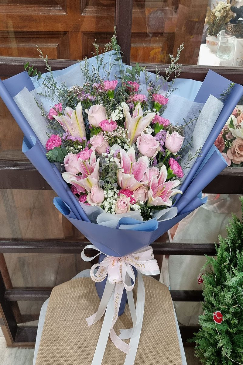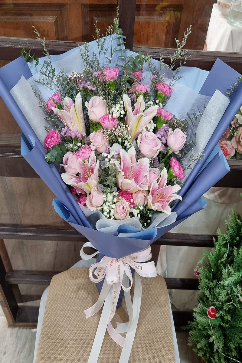 ดอกกุหลาบ  ดอกลิลลี่ และดอกคานชั่น จัดช่อ แซมดอกยิปซี แคสเปียร์
