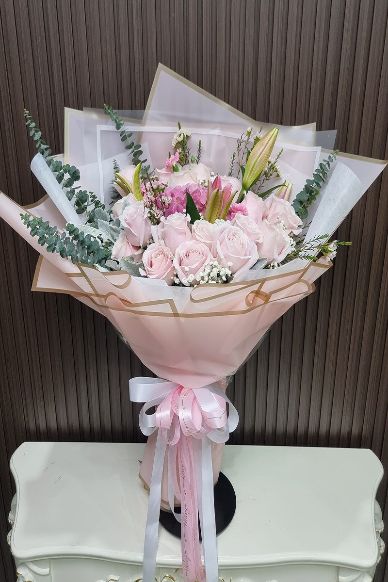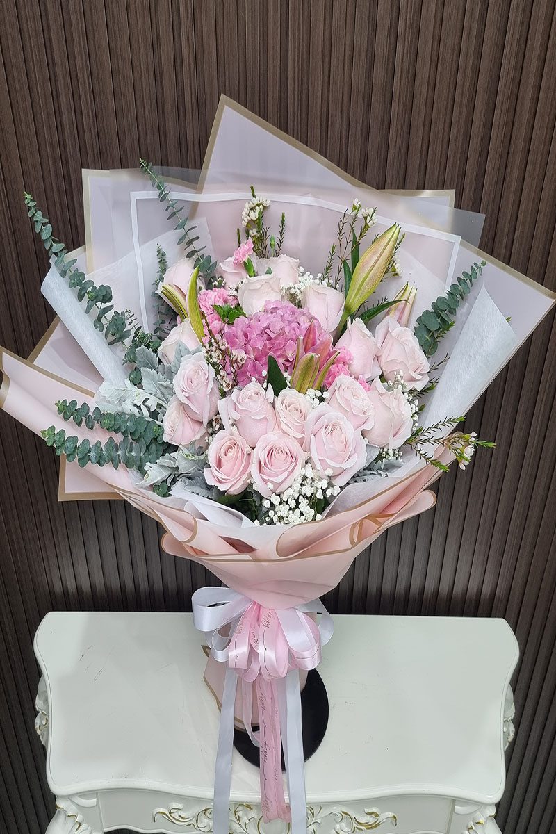 ดอกกุหลาบ  ดอกลิลลี่ และดอกไฮเดรนเยีย จัดช่อ แซมดอกยิปซี แคสเปียร์