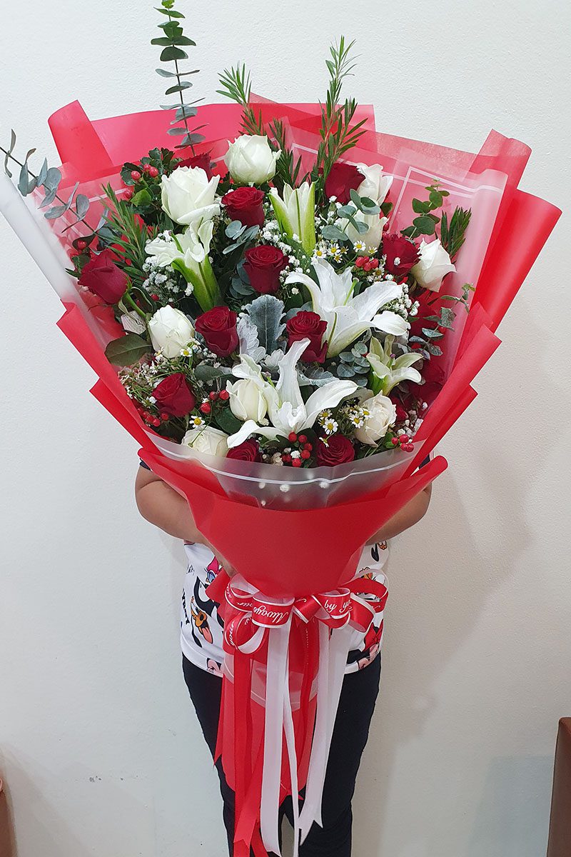 ดอกกุหลาบ  ดอกลิลลี่ และดอกคานชั่น จัดช่อ แซมดอกยิปซี แคสเปียร์