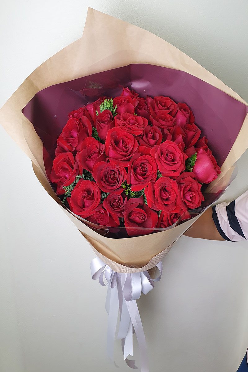 ความหมาย: ช่อดอกกุหลาบสีแดง สื่อถึง ความรัก ความโรแมนติก ความลุ่มหลง และ ความปรารถนา เหมาะสำหรับมอบให้กับคนรัก คู่รัก หรือคนที่คุณรู้สึกพิเศษ ในโอกาสต่างๆ เช่น วันวาเลนไทน์ วันครบรอบ หรือวันเกิด