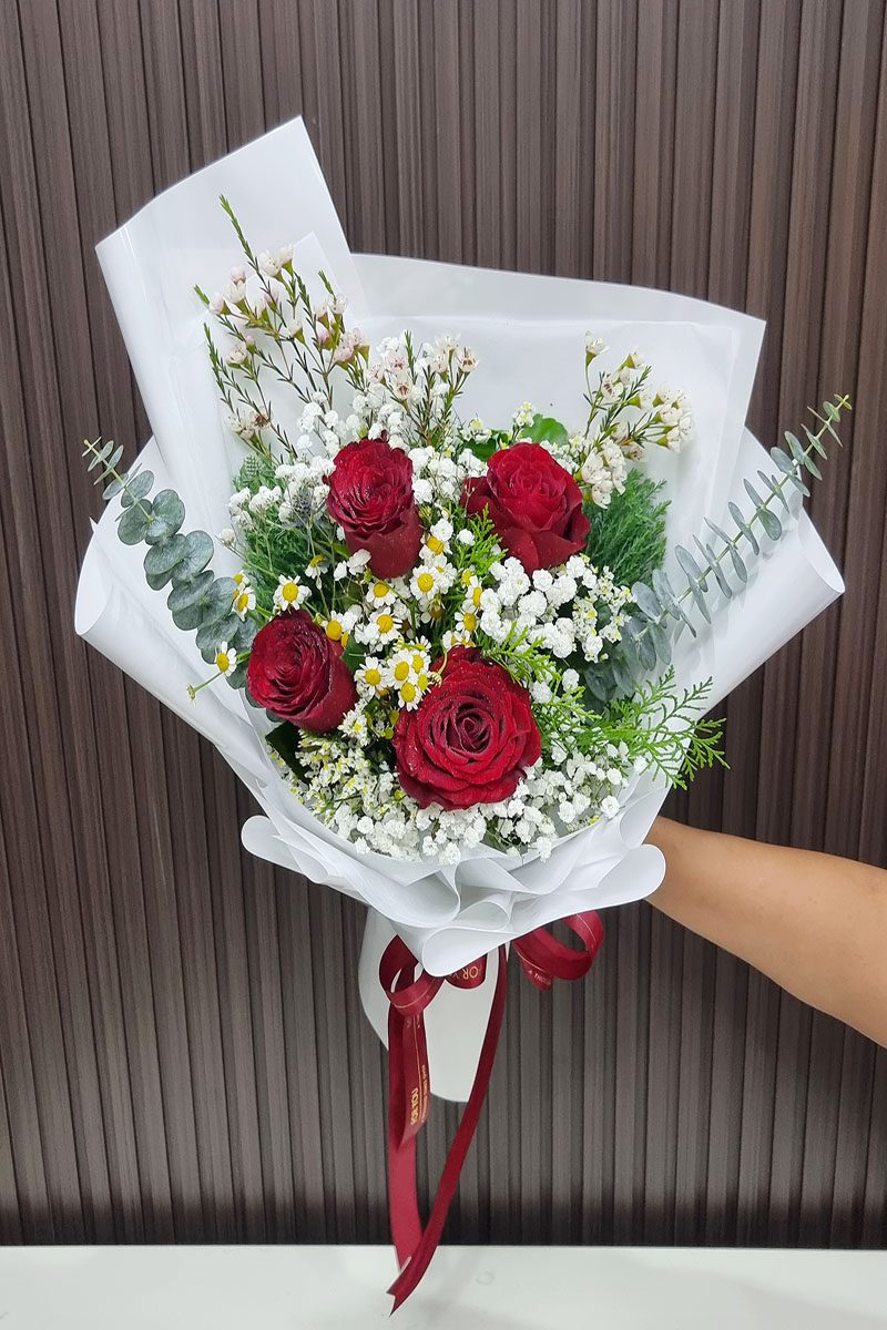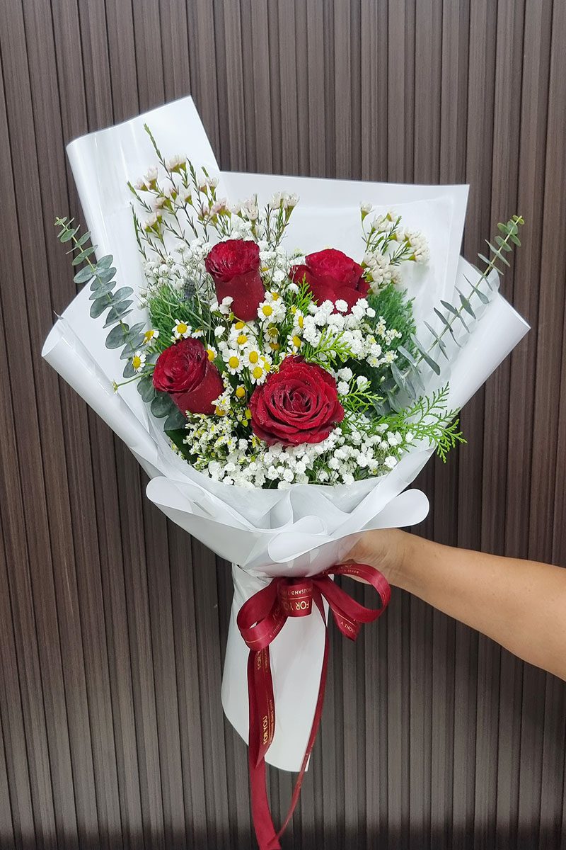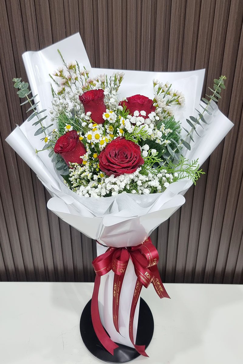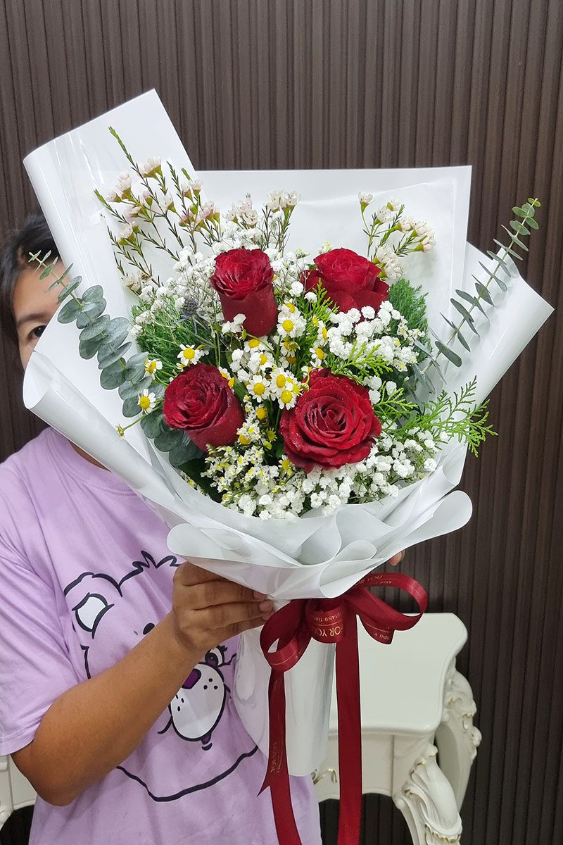 ช่อดอกกุหลาบสีแดง 4 ดอก