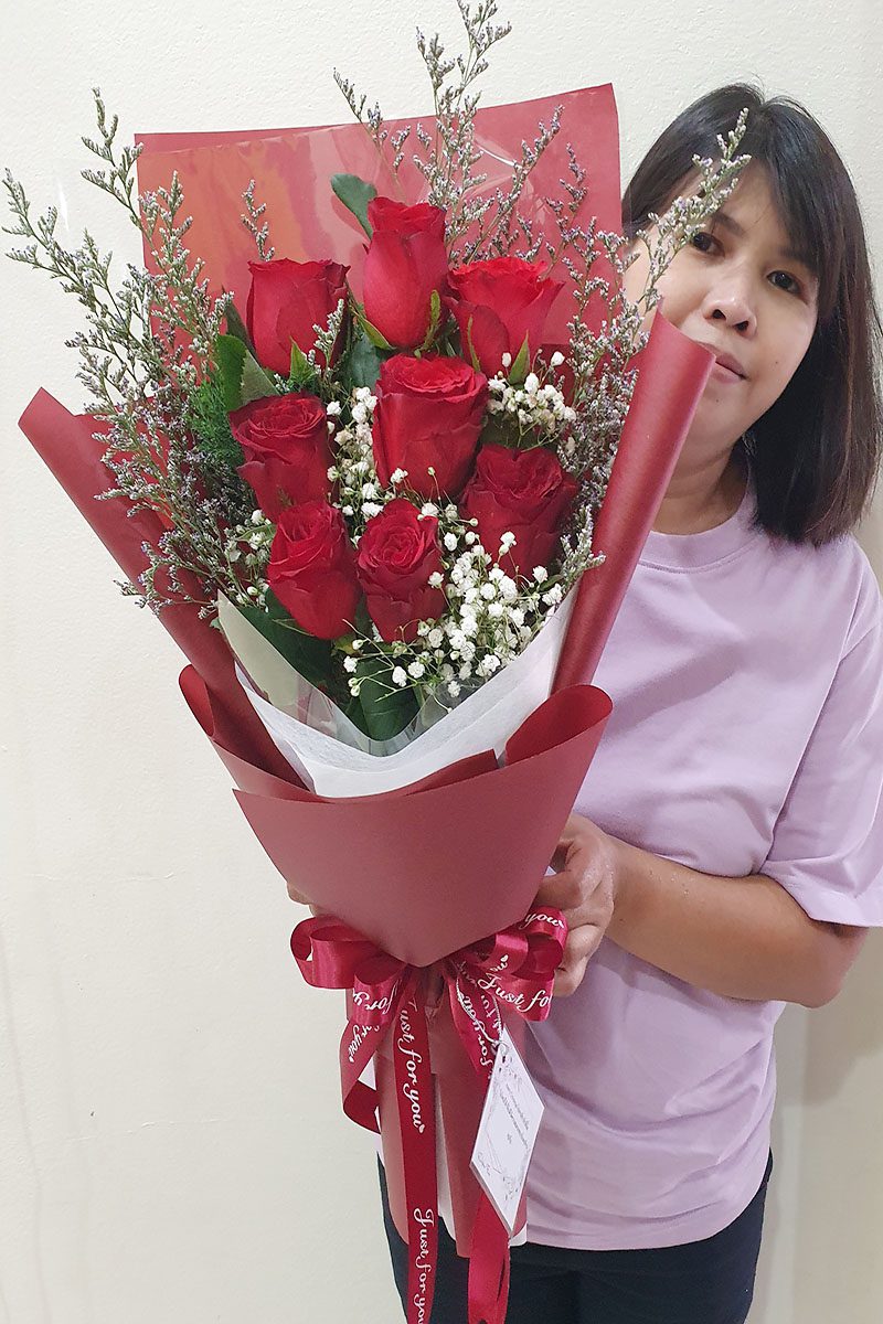 ความหมาย: ช่อดอกกุหลาบสีแดง สื่อถึง ความรัก ความโรแมนติก ความลุ่มหลง และ ความปรารถนา เหมาะสำหรับมอบให้กับคนรัก คู่รัก หรือคนที่คุณรู้สึกพิเศษ ในโอกาสต่างๆ เช่น วันวาเลนไทน์ วันครบรอบ หรือวันเกิด