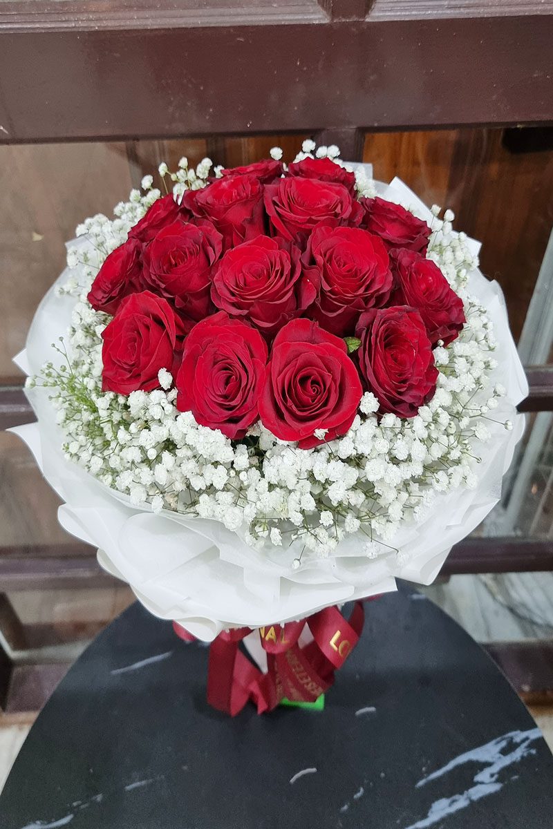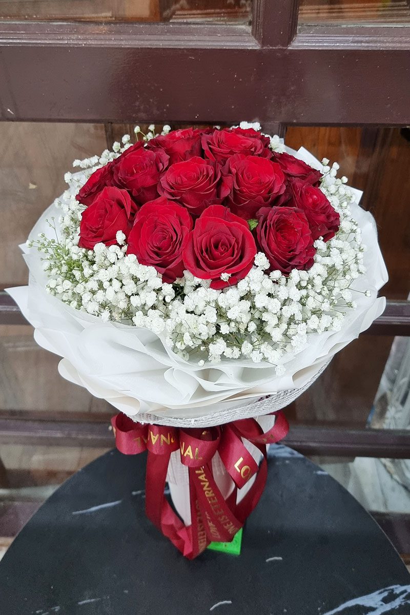 ดอกกุหลาบสีแดง จัดช่อ แซมดอกยิปซี แคสเปียร์