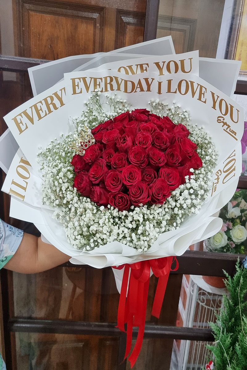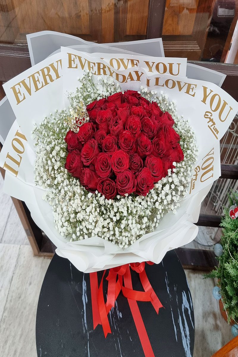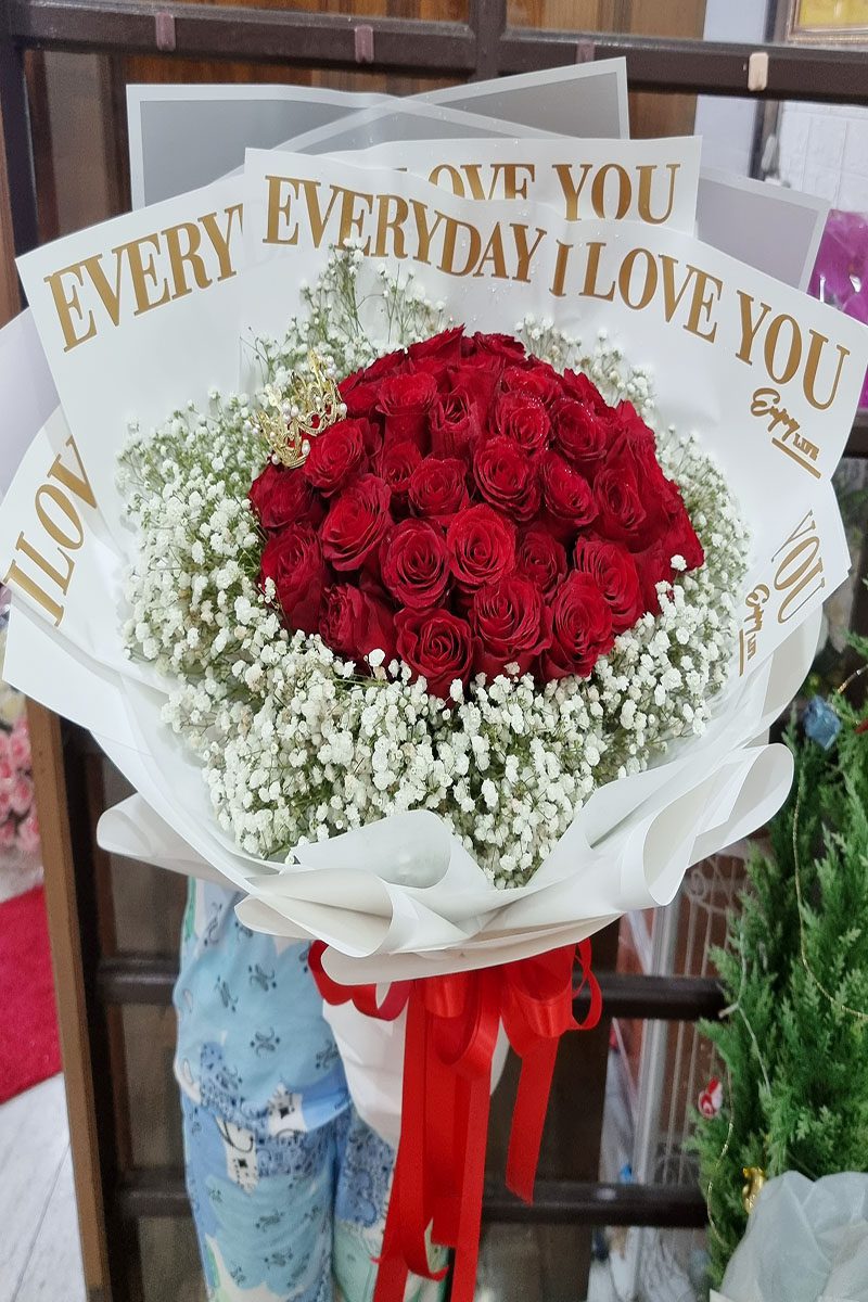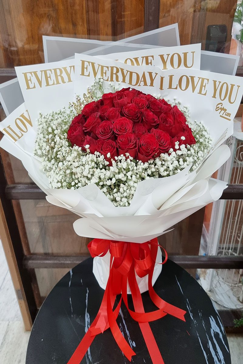 ความหมาย: ช่อดอกกุหลาบสีแดง สื่อถึง ความรัก ความโรแมนติก ความลุ่มหลง และ ความปรารถนา เหมาะสำหรับมอบให้กับคนรัก คู่รัก หรือคนที่คุณรู้สึกพิเศษ ในโอกาสต่างๆ เช่น วันวาเลนไทน์ วันครบรอบ หรือวันเกิด