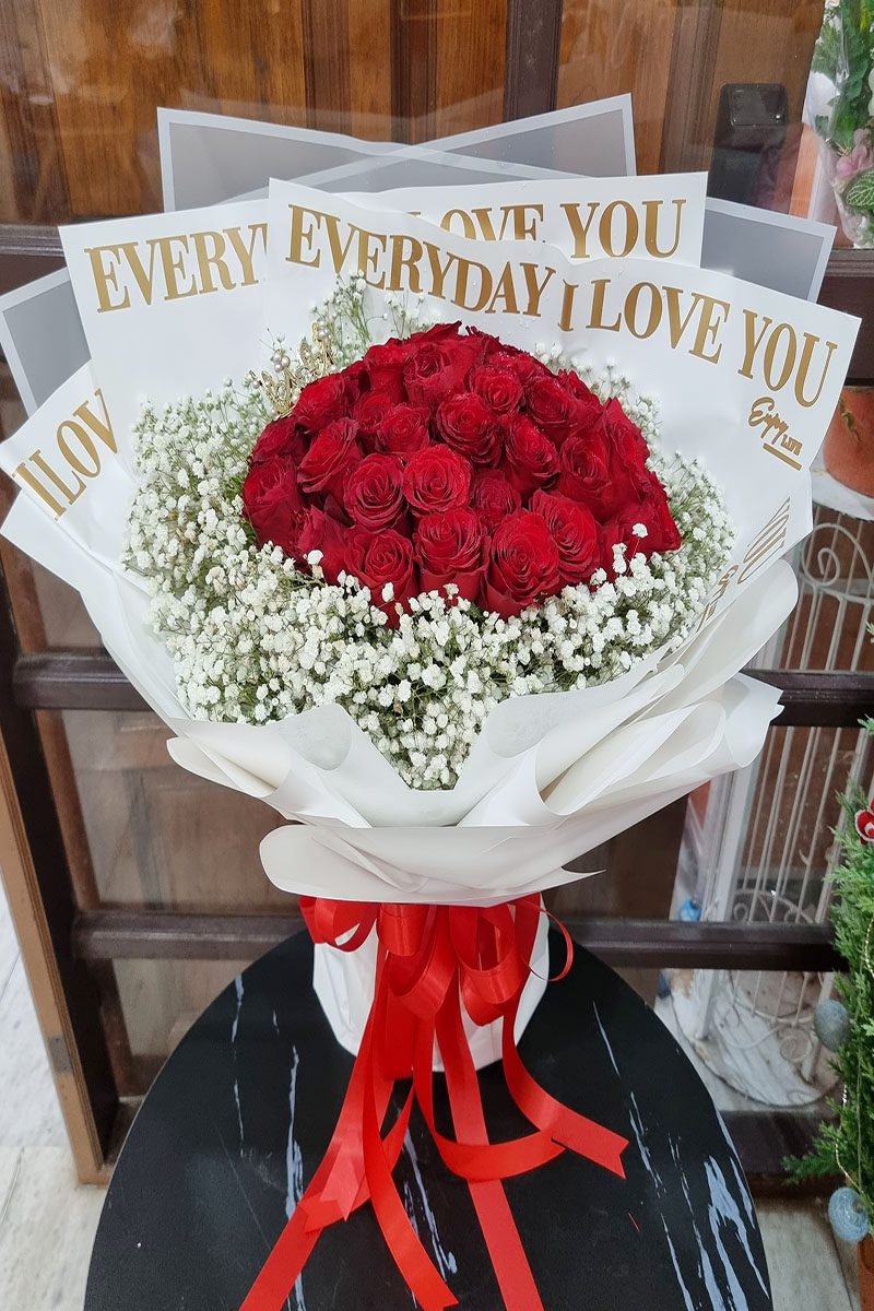 ดอกกุหลาบสีแดง จัดช่อ แซมดอกยิปซี