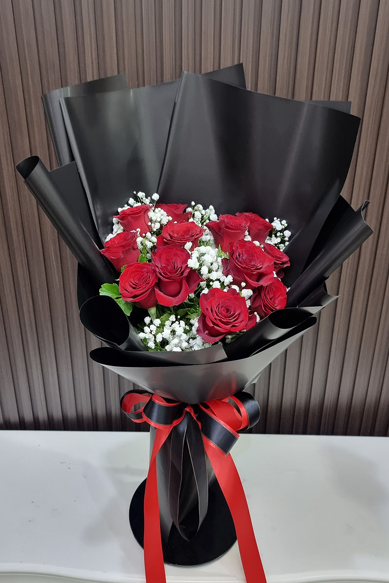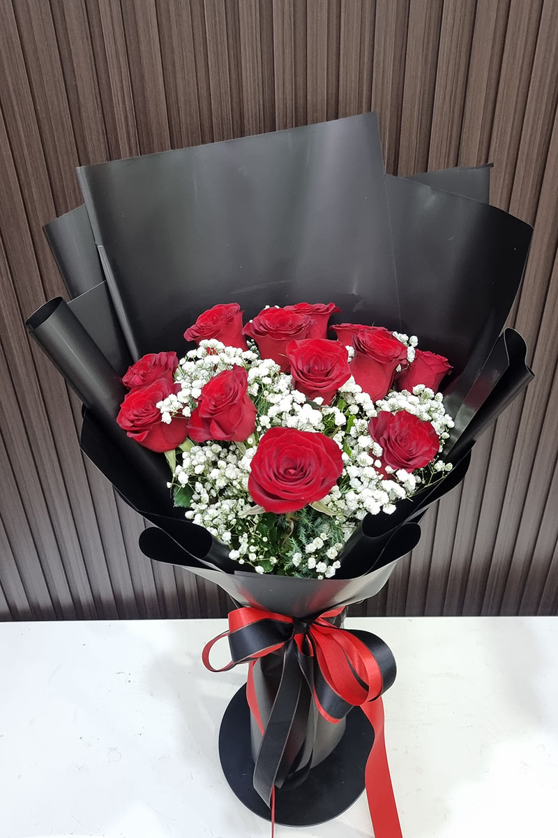 ดอกกุหลาบสีแดง 10 ดอก จัดช่อ แซมดอกยิปซี