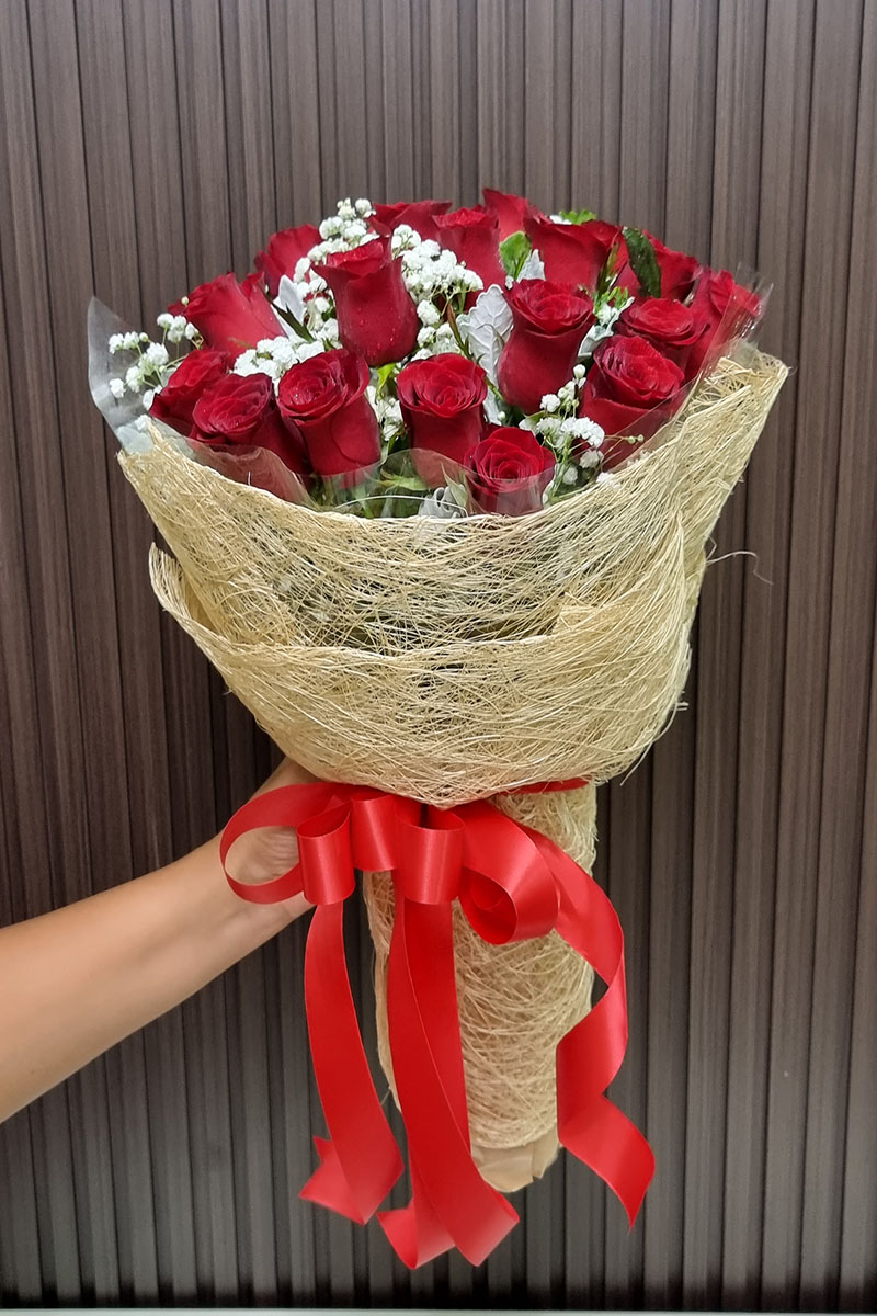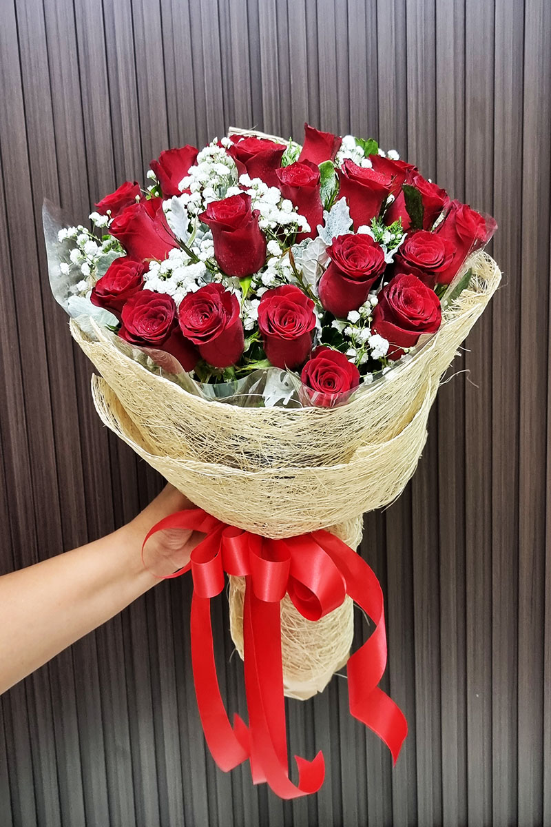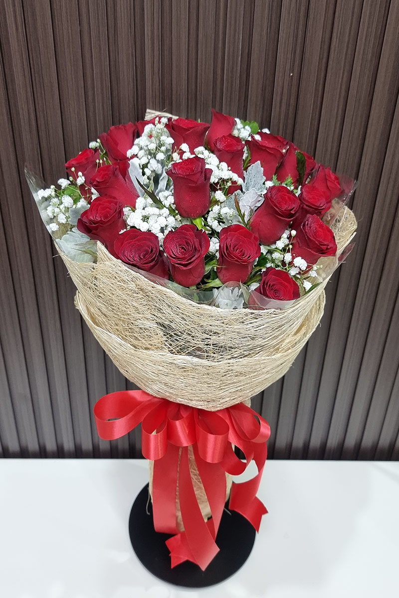 ดอกกุหลาบสีแดง 20 ดอก จัดช่อ แซมดอกยิปซี แคสเปียร์