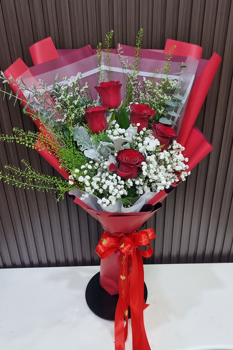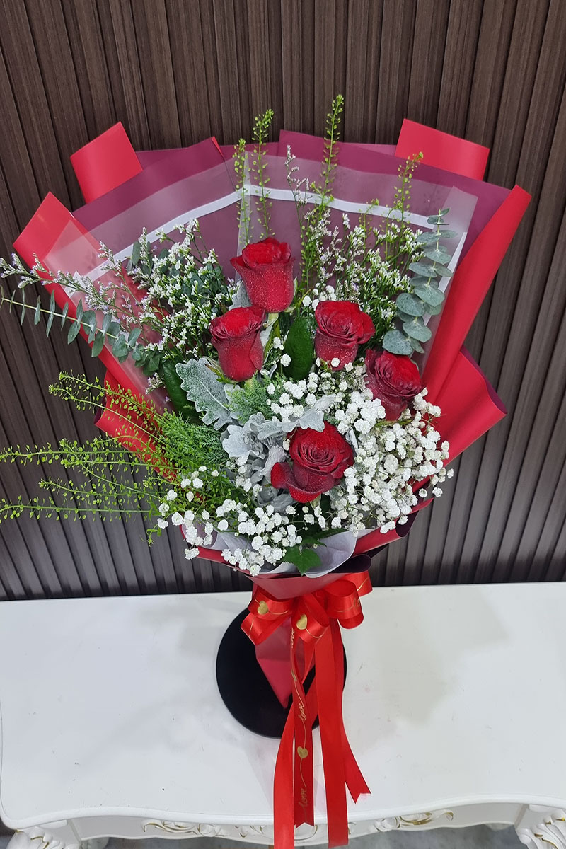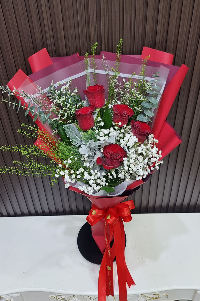 ดอกกุหลาบสีแดง 5 ดอก จัดช่อ แซมดอกยิปซี แคสเปียร์
