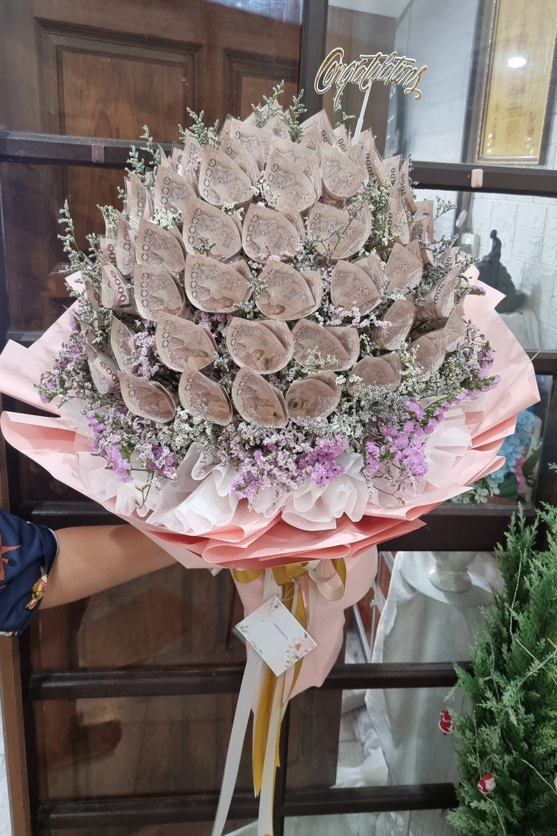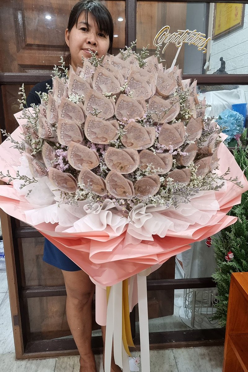 ช่อแบงค์ม้วนเป็นดอกไม้  ใส่เงินทั้งหมด   90,000   บาท