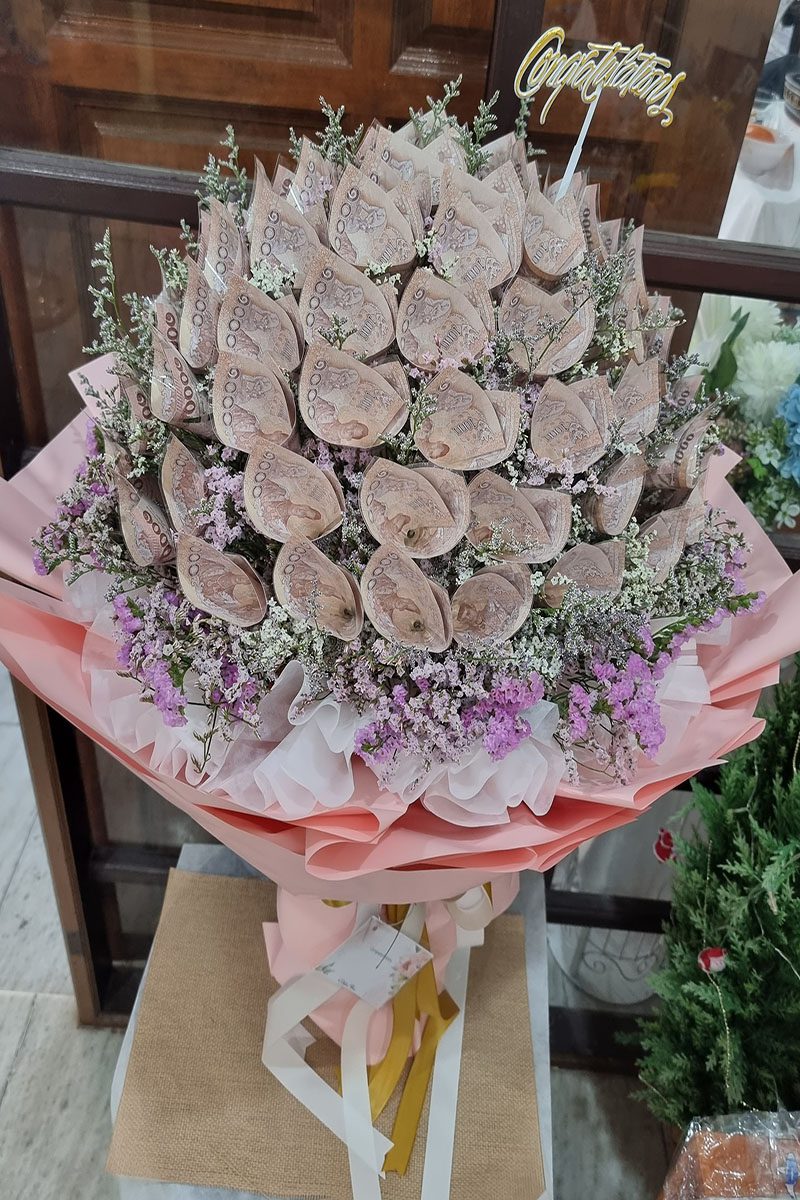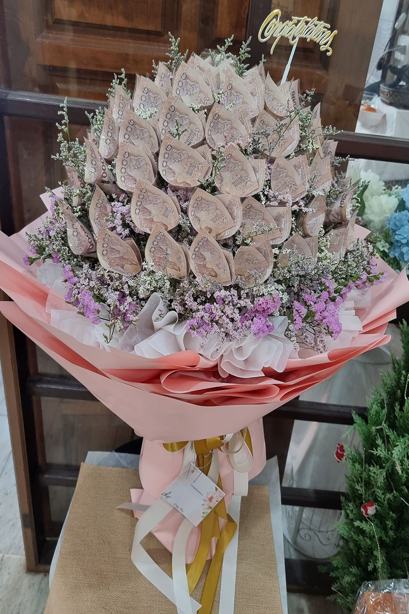 ราคาช่อจะขึ้นอยู่กับ เงินในช่อ ขนาดช่อ และดอกไม้ตกแต่งภายในช่อ