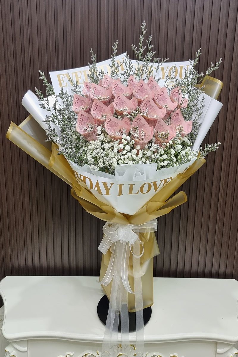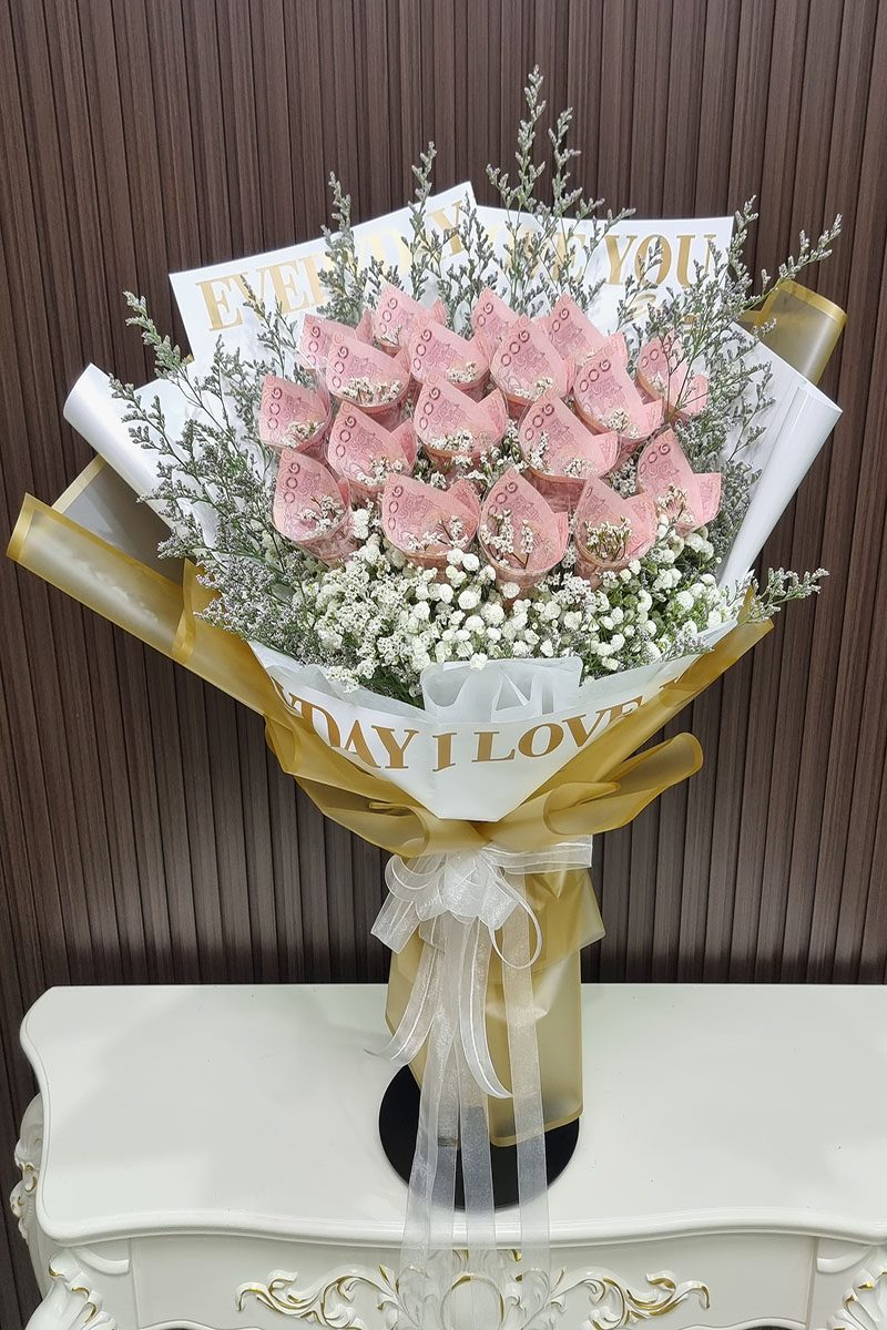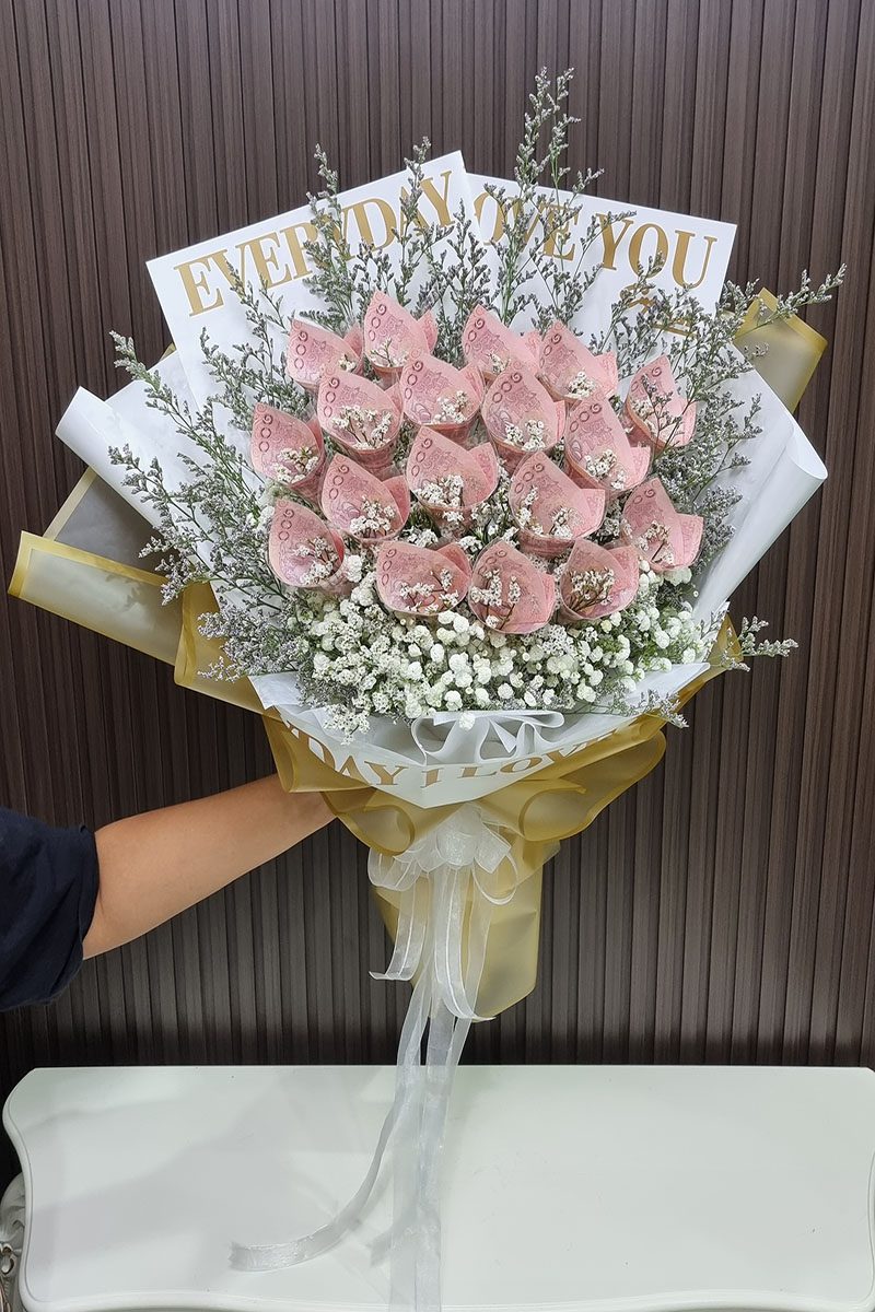 ราคาช่อจะขึ้นอยู่กับ เงินในช่อ ขนาดช่อ และดอกไม้ตกแต่งภายในช่อ
