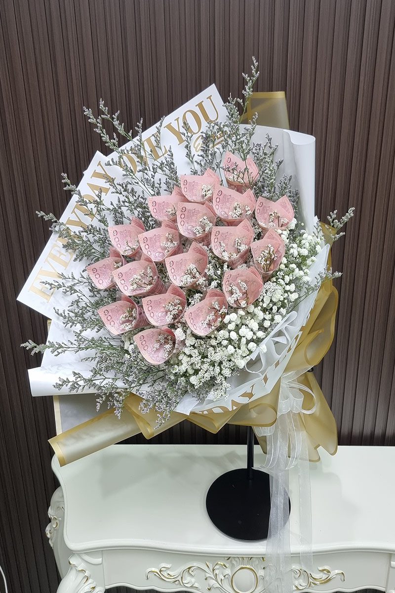 ทั้งจำนวนเงินในช่อ  ชนิดของแบงค์ 100/500/1000  โทนสีดอกไม้  และกระดาษห่อ เปลี่ยนได้