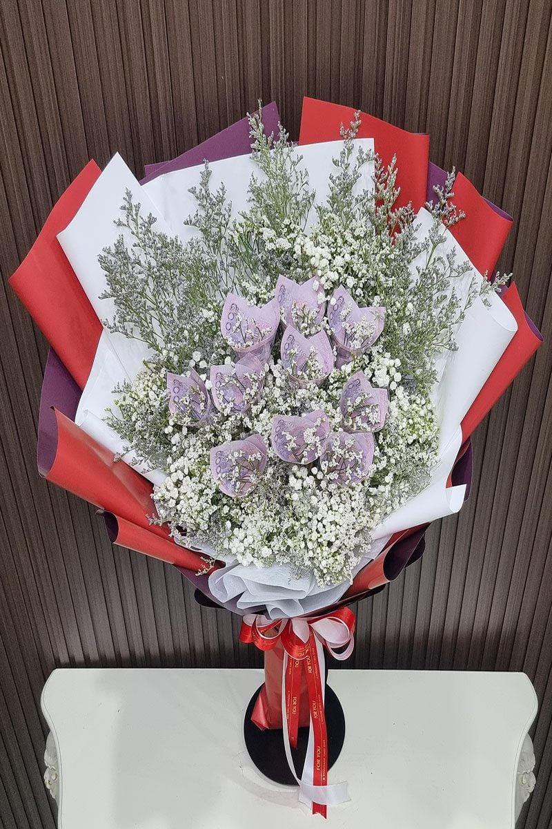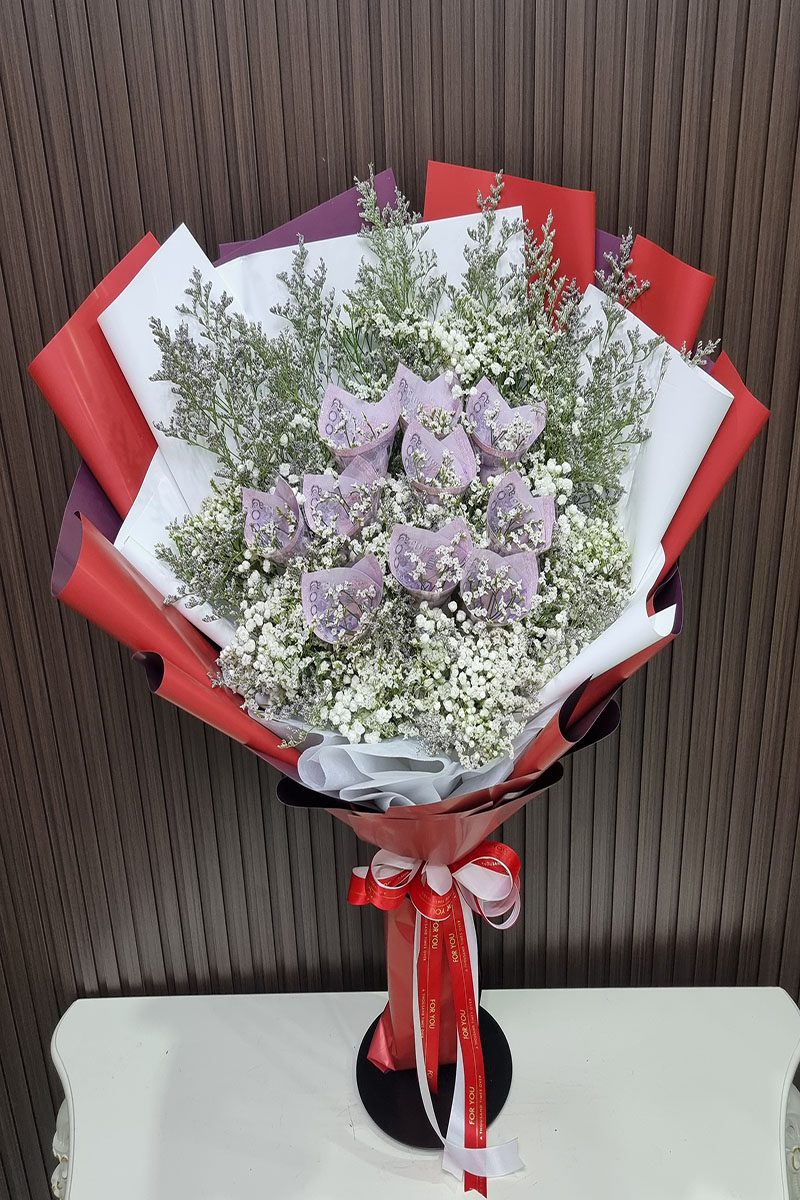 ราคาช่อจะขึ้นอยู่กับ เงินในช่อ ขนาดช่อ และดอกไม้ตกแต่งภายในช่อ