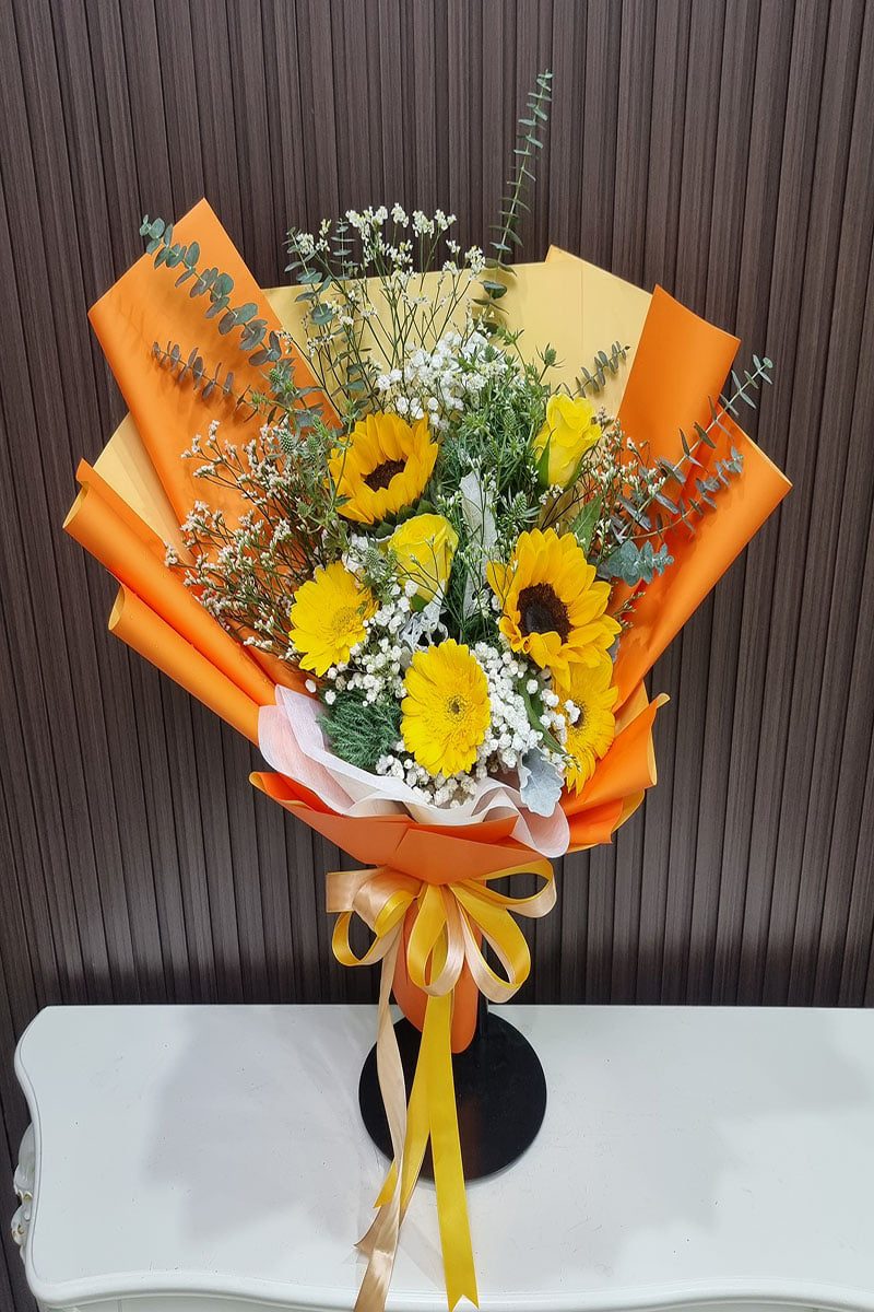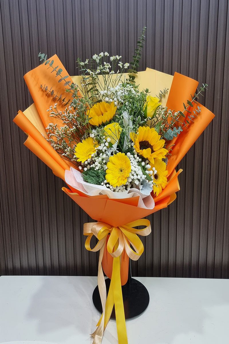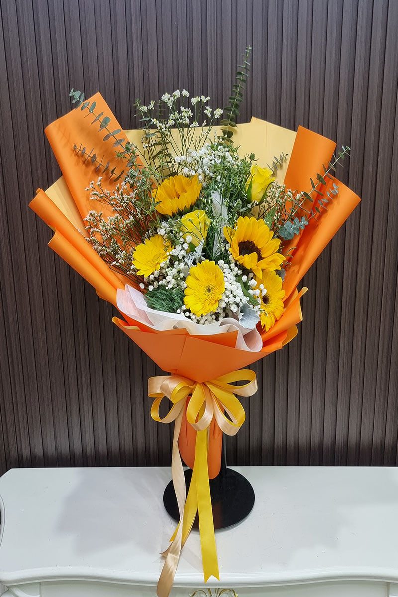 ดอกทานตะวัน 2 ดอก ดอกเยอบีร่าเหลือง ดอกกุหลาบ จัดช่อ แซมดอกยิปซี แคสเปียร์
