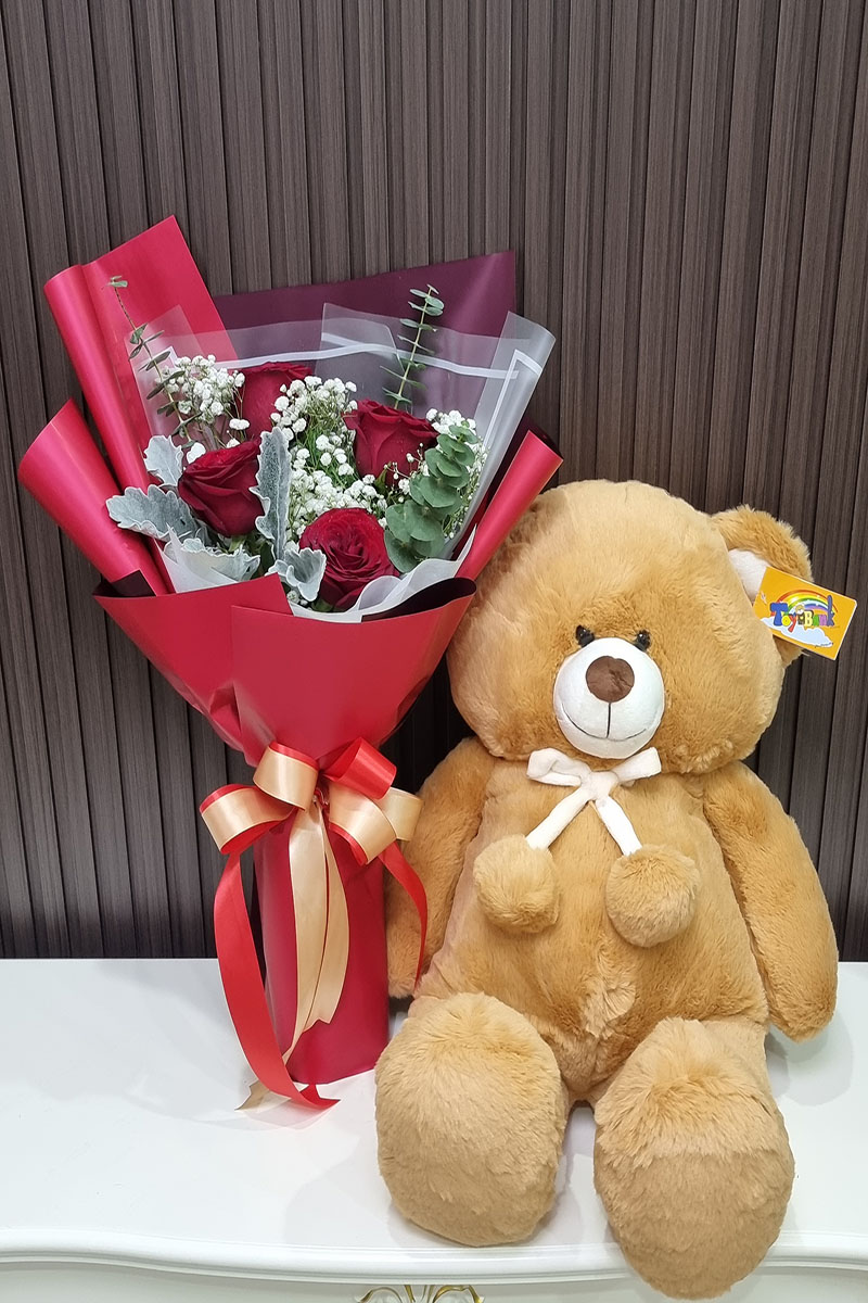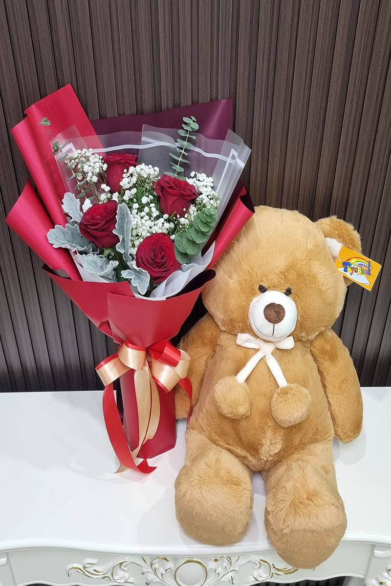 ห่อกระดาษโทนสี แดง จับคู่กับตุ๊กตาหมีขนาด 18 นิ้ว เลือกสีตุ๊กตาได้