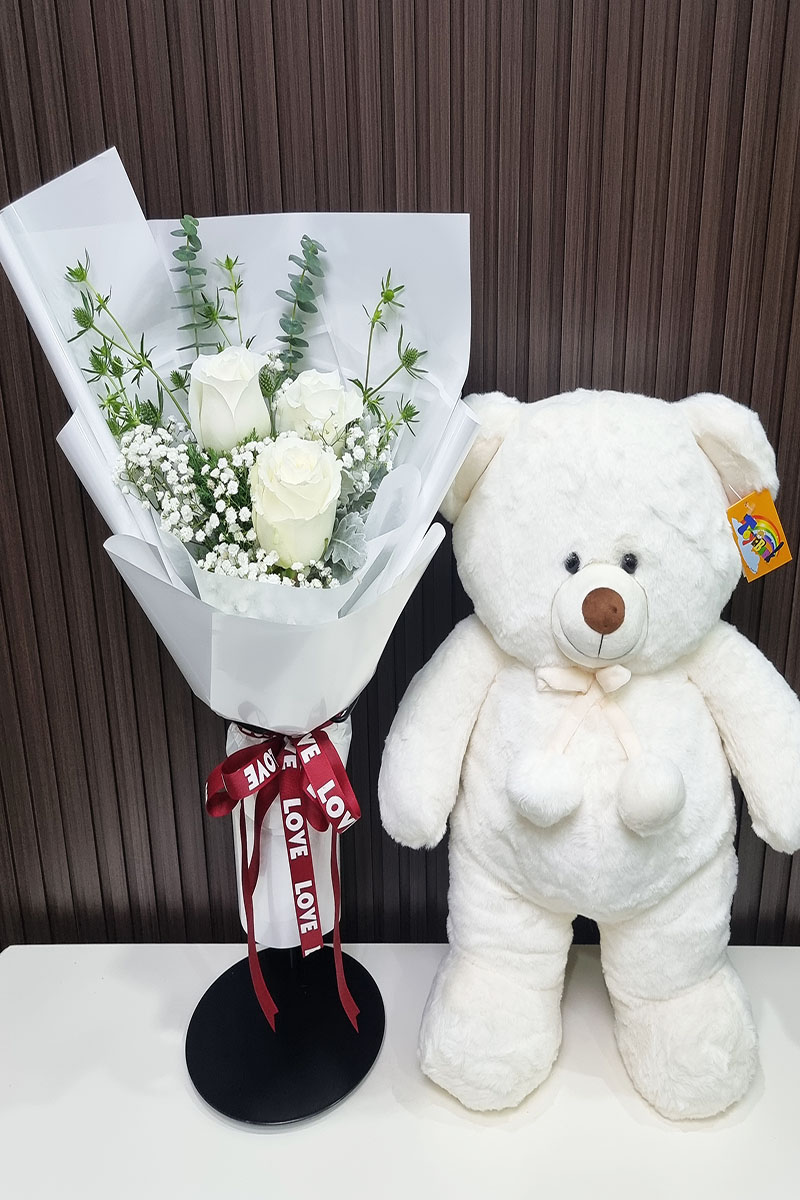 ดอกกุหลาบสีขาว 3 ดอก จัดช่อ แซมดอกยิปซี แคสเปียร์